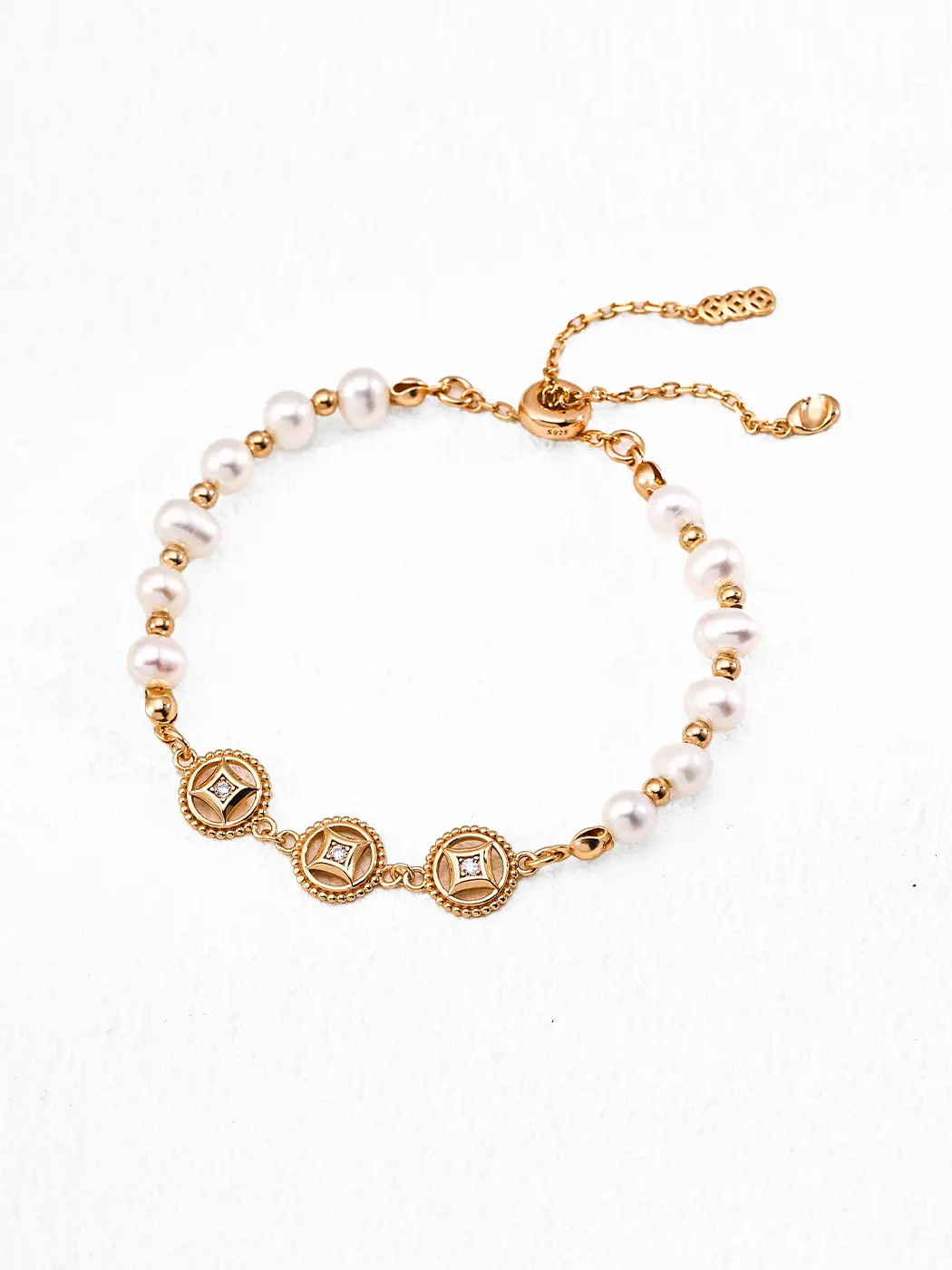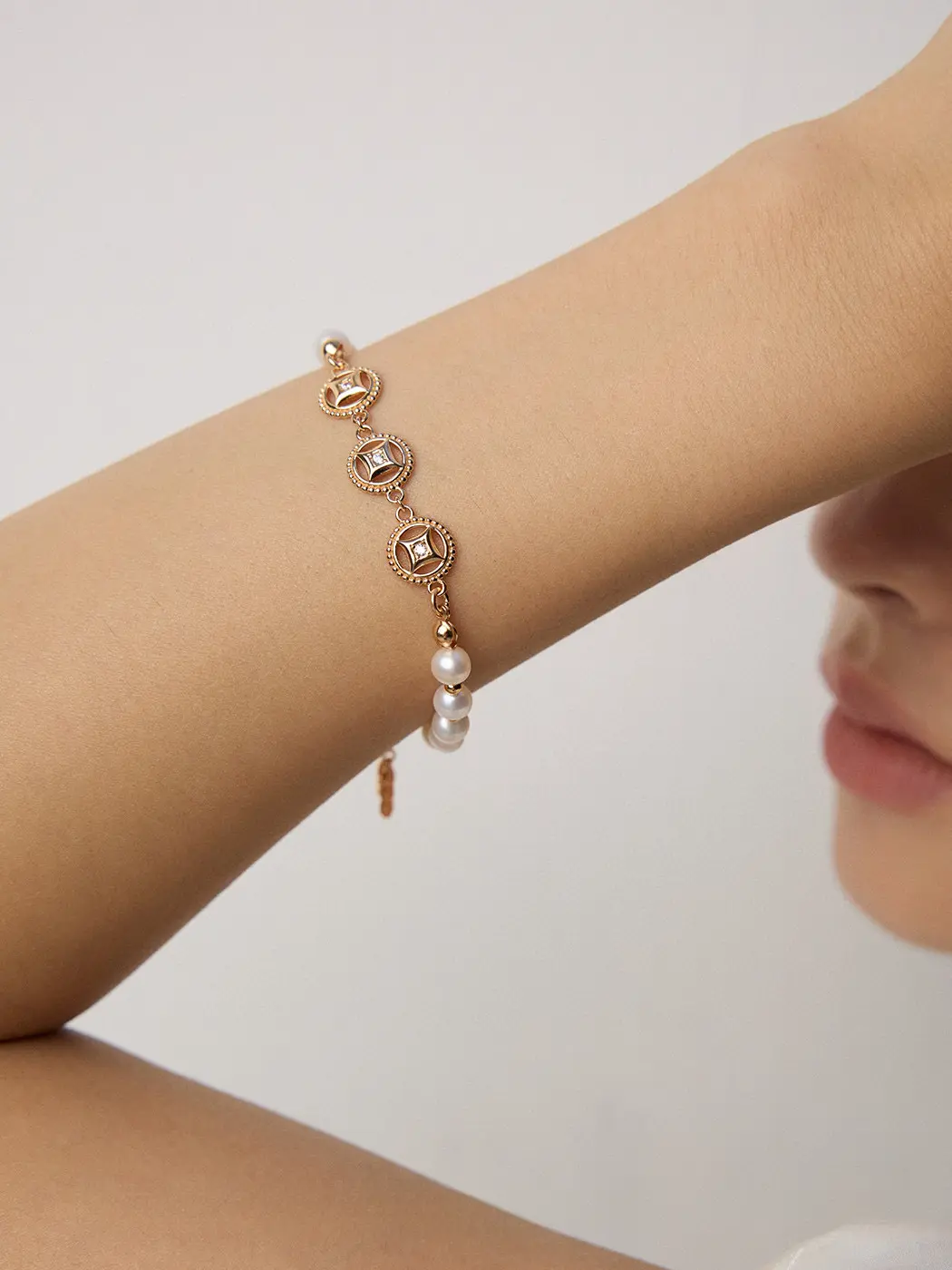 Together, the pearls and coin charm harmonize to create a bracelet that is both visually beautiful and spiritually significant.