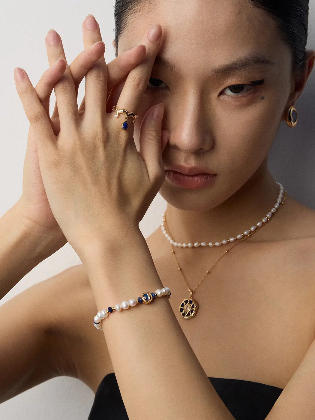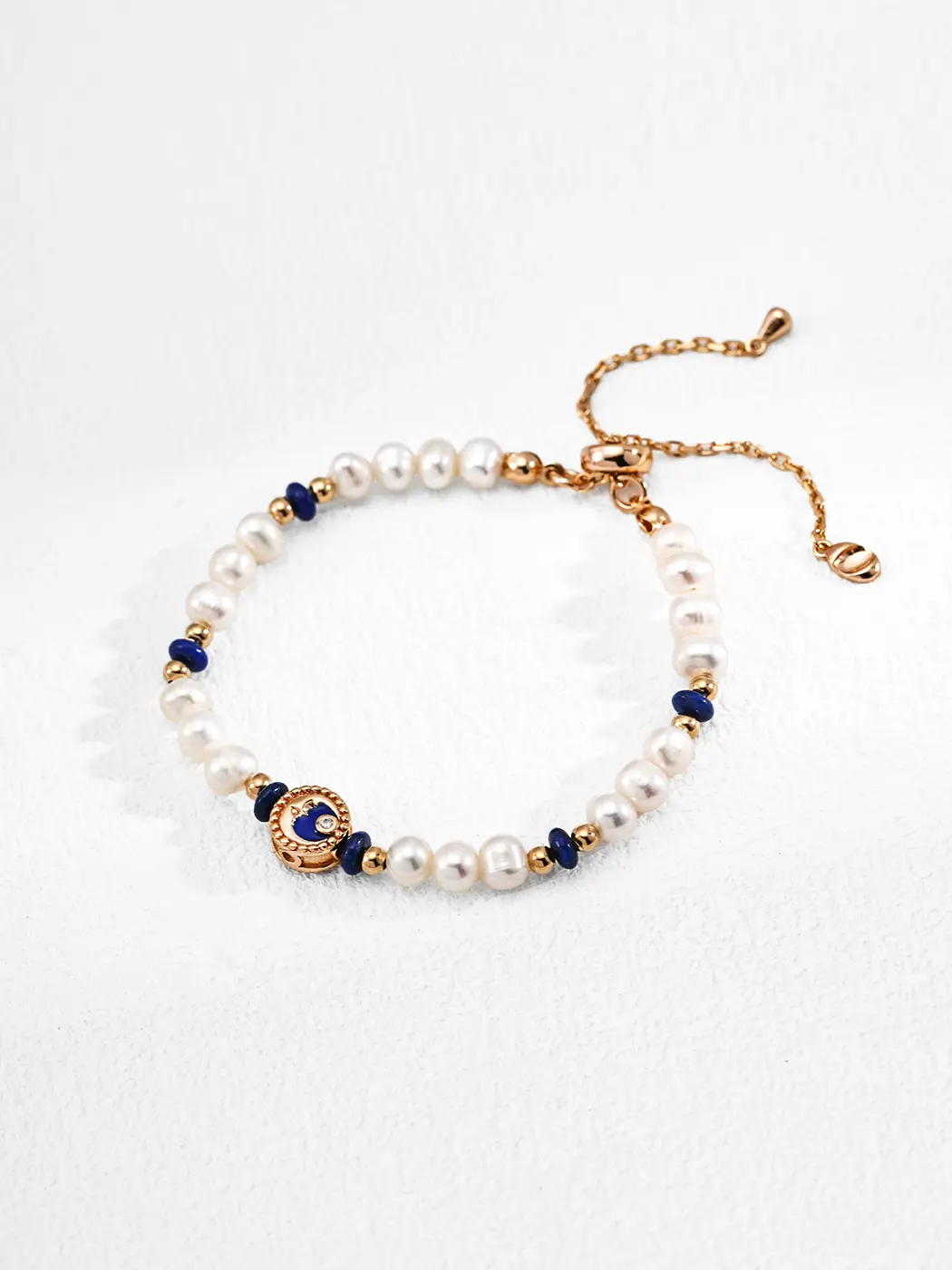 Crafted from premium 925 sterling silver with warm vintage-gold plating, this bracelet combines durability with sophistication. Each pearl highlights its organic luster, while lapis lazuli reflects wisdom and artistic elegance. Together, these elements form a bracelet that feels both modern and classic.