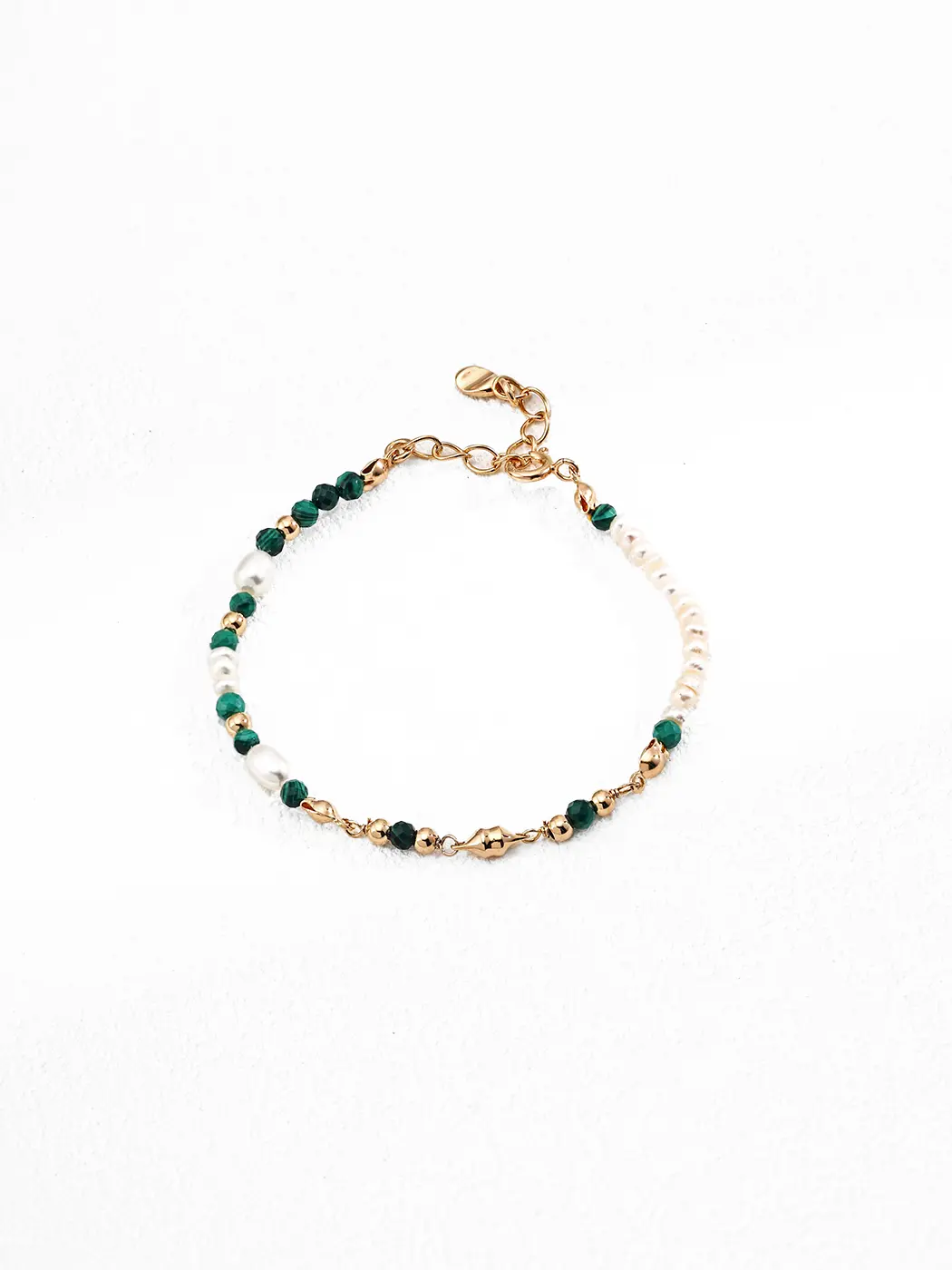 The Pearl Malachite Bracelet combines 4–5 mm natural pearls with 3 mm malachite beads, arranged along a delicate 16 cm chain with a 3 cm extender. The vintage-gold plating enhances the pearls’ soft iridescence and the malachite’s rich green hues, creating a design that radiates both vibrancy and sophistication.