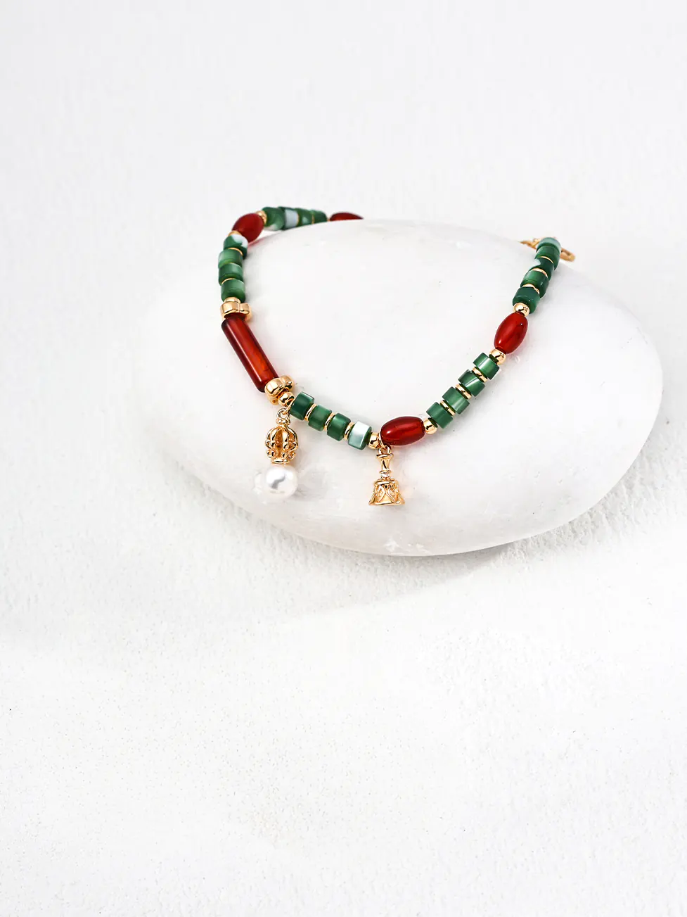 Made from premium S925 sterling silver with a durable vintage-gold finish, this bracelet highlights fine craftsmanship and high-quality gemstones. Natural pearls glow with timeless charm, red onyx introduces bold color and grounding energy, while green shell beads add natural shimmer and contrast. Together, they create a harmonious design that feels both classic and vibrant.