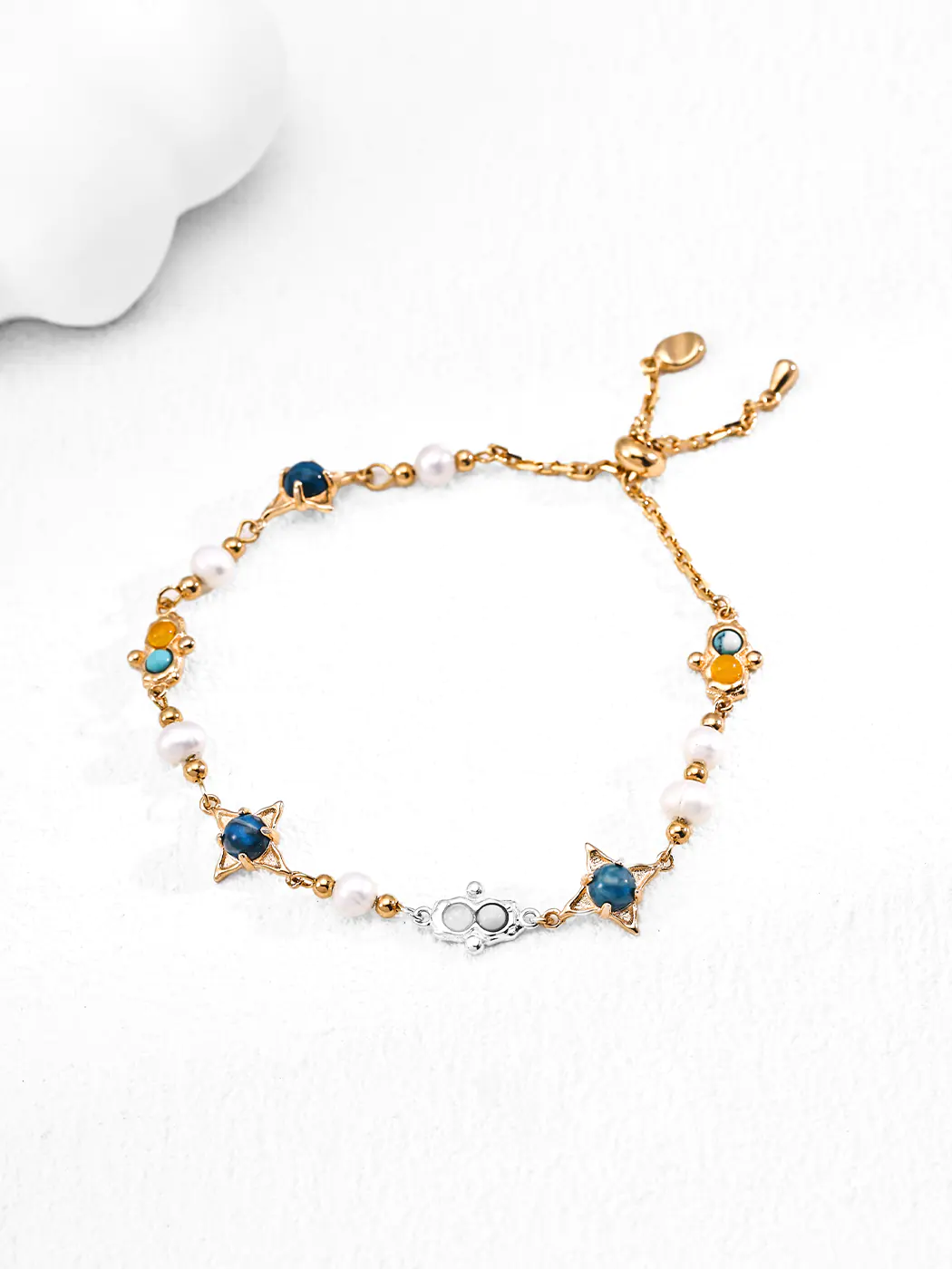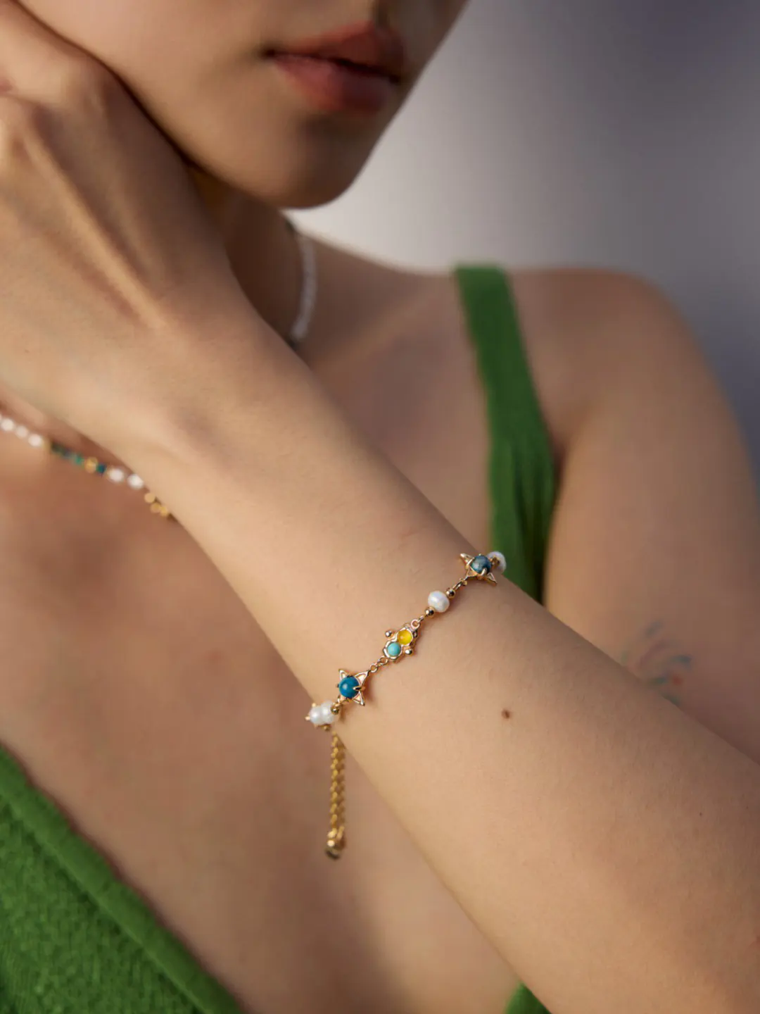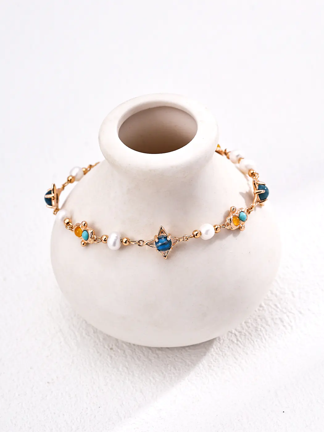 Crafted in high-quality S925 sterling silver with vintage-gold plating,this sterling silver pearl turquoise bracelet combines durability with artisanal beauty.Natural pearls complement the polished silver, while the gemstones bring color and symbolism.