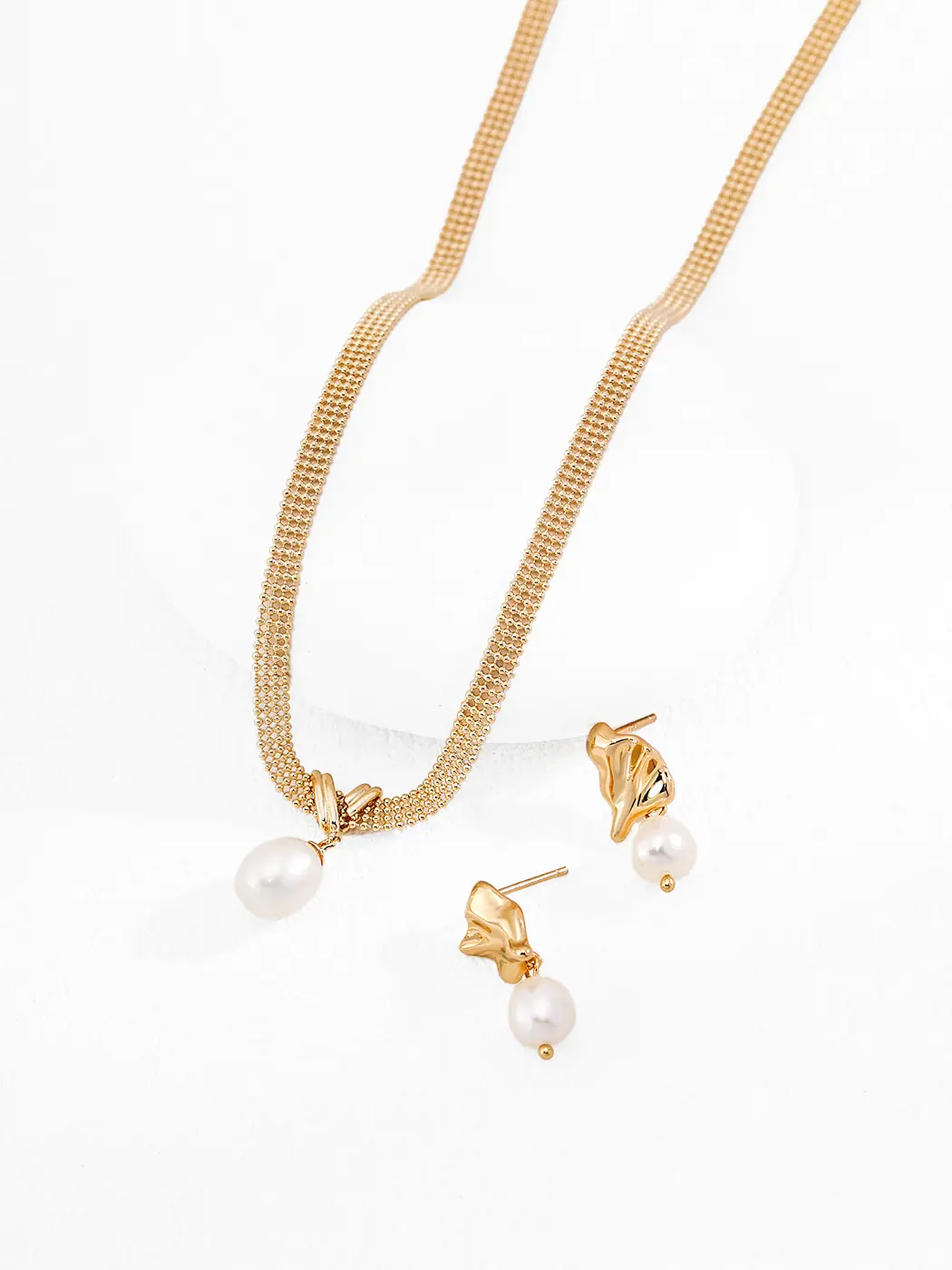 This necklace uses S925 sterling silver plated with 18K gold to achieve warmth and lasting brightness. The mesh chain features dense, fine links that offer both texture and flexibility. The natural pearl measures around 10×8 mm, and its glow brings softness to the structured chain. The V-shaped pendant adds a contemporary touch, and the 36 cm length plus 6 cm extender allows easy adjustment to match different outfits.