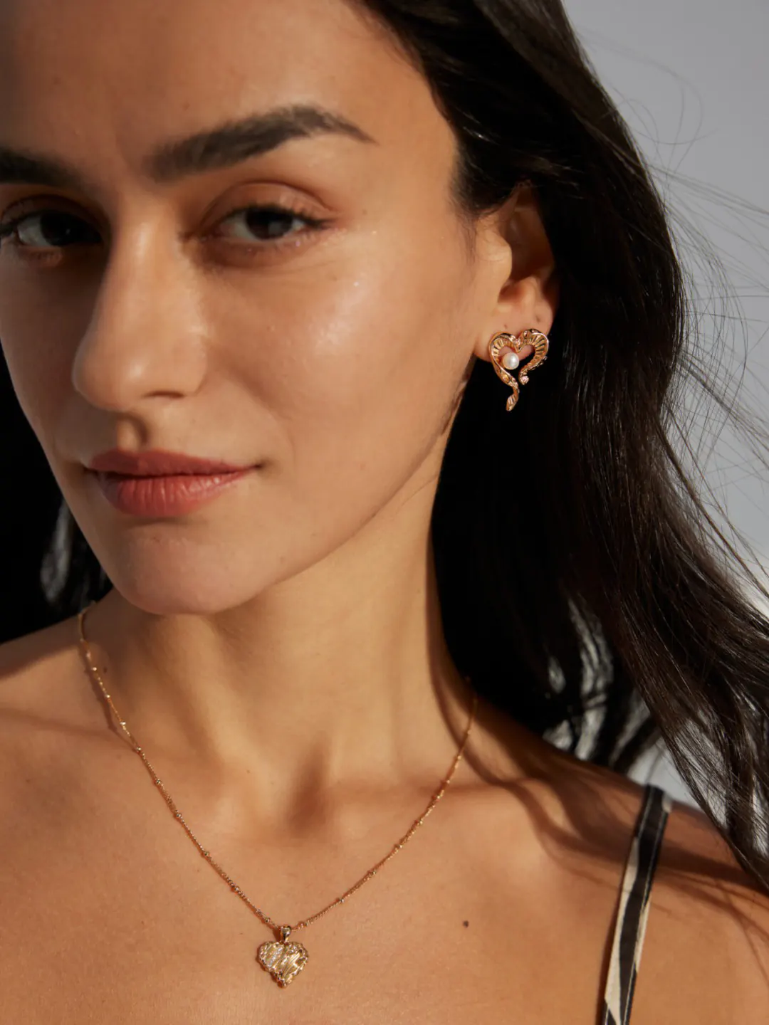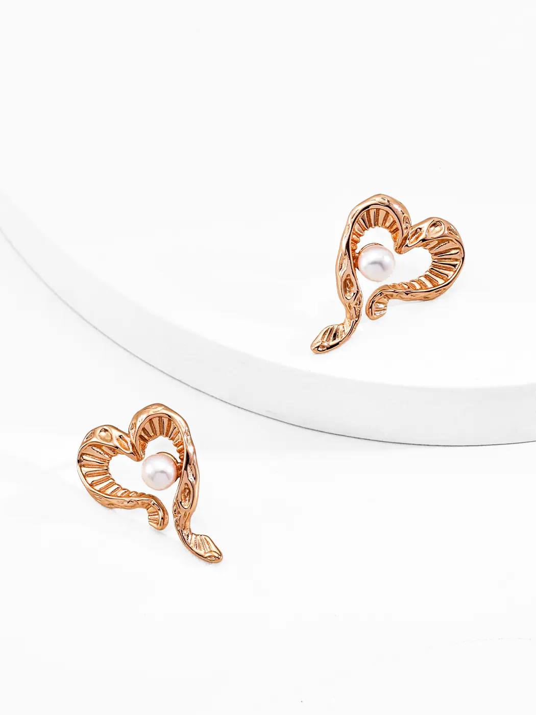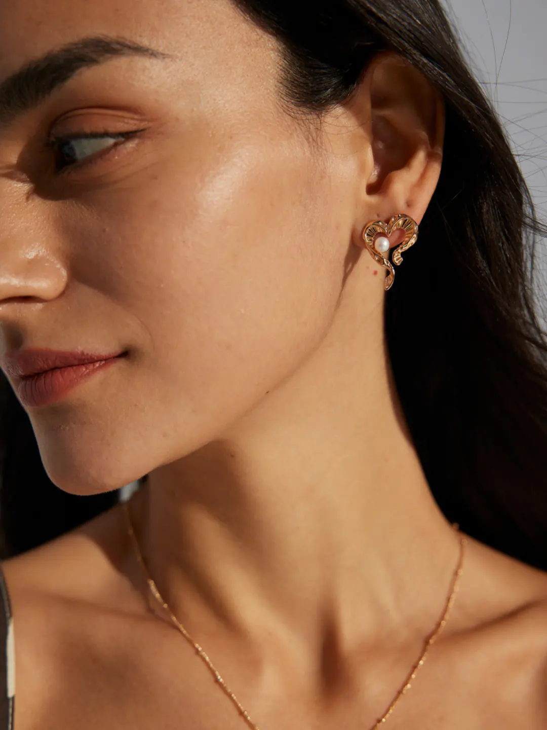 Python Heart Pearl Studs trace a flowing heart that curves like a gentle serpent. A round natural pearl rests near the center and glows softly. The sculpted texture catches light and adds fine depth. Moreover, warm gold tones flatter every skin tone. The silhouette hugs the lobe for a confident, feminine look. Therefore, the design feels romantic yet modern. It reads delicate, yet it still shows character. As a result, the earrings lift casual outfits and evening looks with ease.