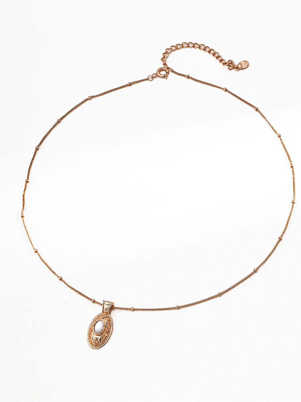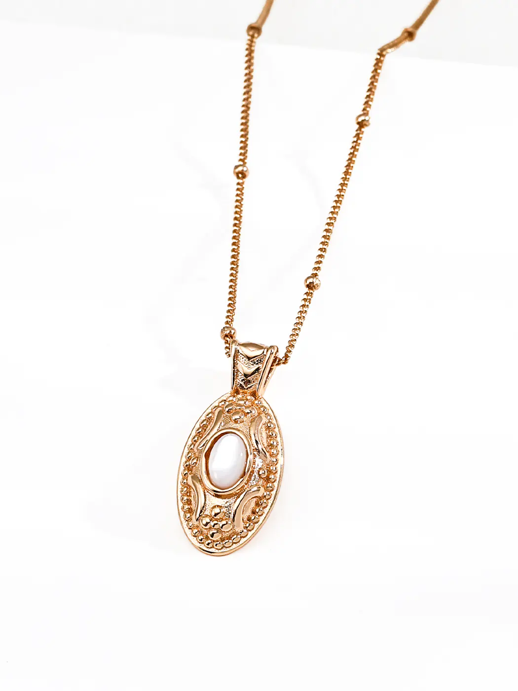 - Features oval reliquary pendant with mother-of-pearl center