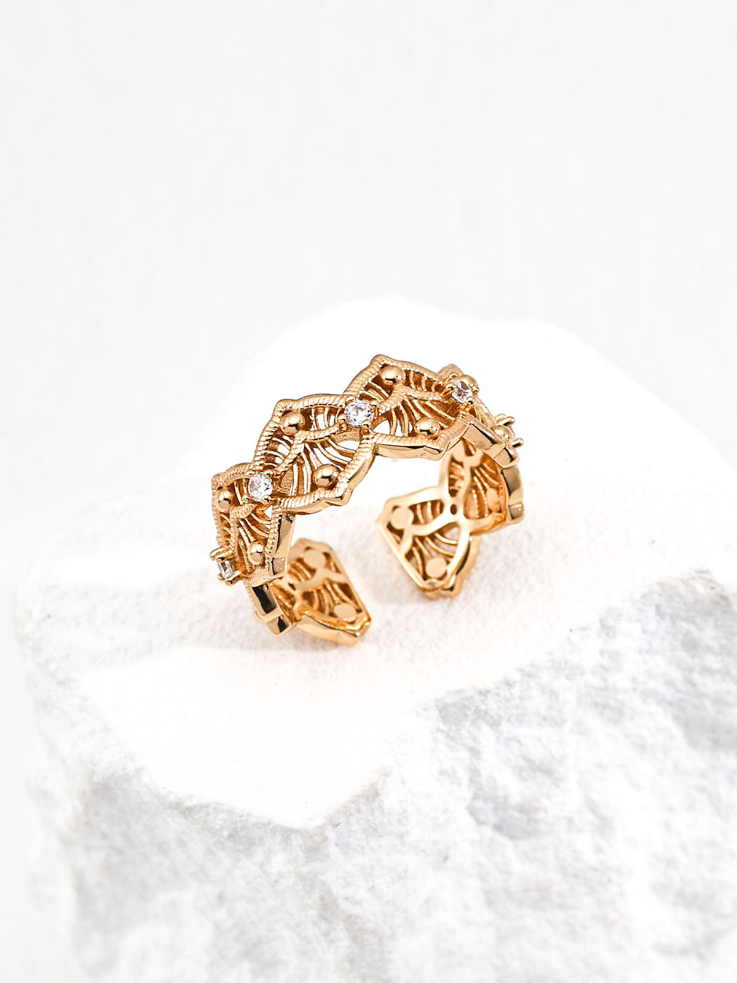 This retro filigree zircon ring showcases intricate craftsmanship and timeless elegance. The open band design features ornate filigree patterns with sparkling zircon accents. Moreover, the hollow structure adds depth and lightness, creating a vintage-inspired look that feels both bold and refined. As a result, this ring blends classic artistry with modern wearability.
