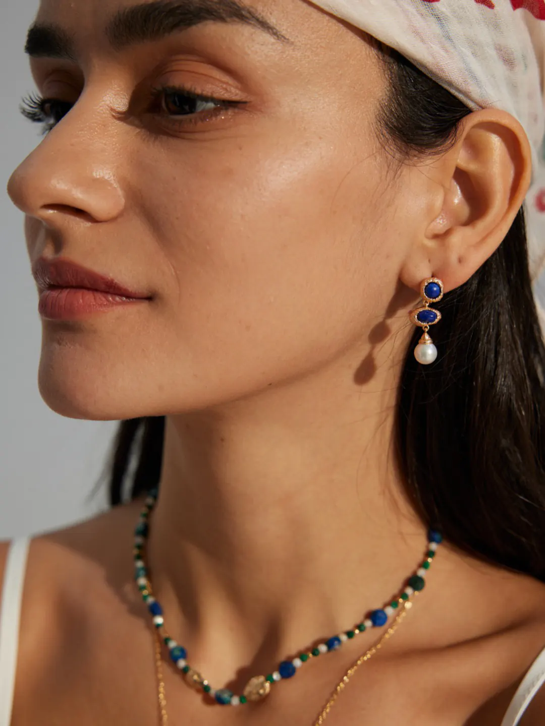 Build a coastal-chic story with linen or denim. Also layer slim gold chains to echo the texture. For work, choose a crisp white shirt and navy blazer. The blue stones tie the outfit together. For evenings, try silk slips or tailored jumpsuits. Add a lapis necklace for a curated match. Meanwhile, a bare neckline keeps focus on the drops. Hair up or tucked behind the ear works best.