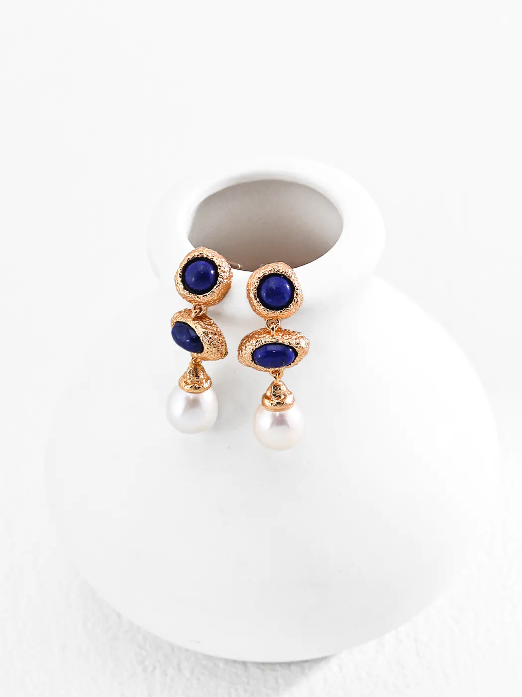 Rough-hewn gold frames meet deep blue cabochons. The shapes look handcrafted, like tiny pebbles from a shore. Each lapis oval sits in a textured bezel. Then a creamy pearl drop finishes the line with grace. Light dances over the hammered surfaces. As a result, the earrings feel vivid and alive. Rocaille Lazuli Pearls sets the tone with artful contrast and clear color. The silhouette stays balanced and easy to wear. You get movement, but the scale remains refined.