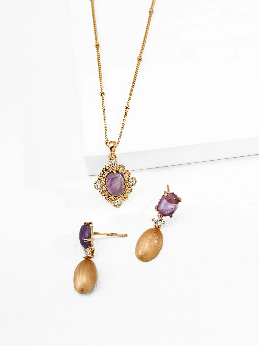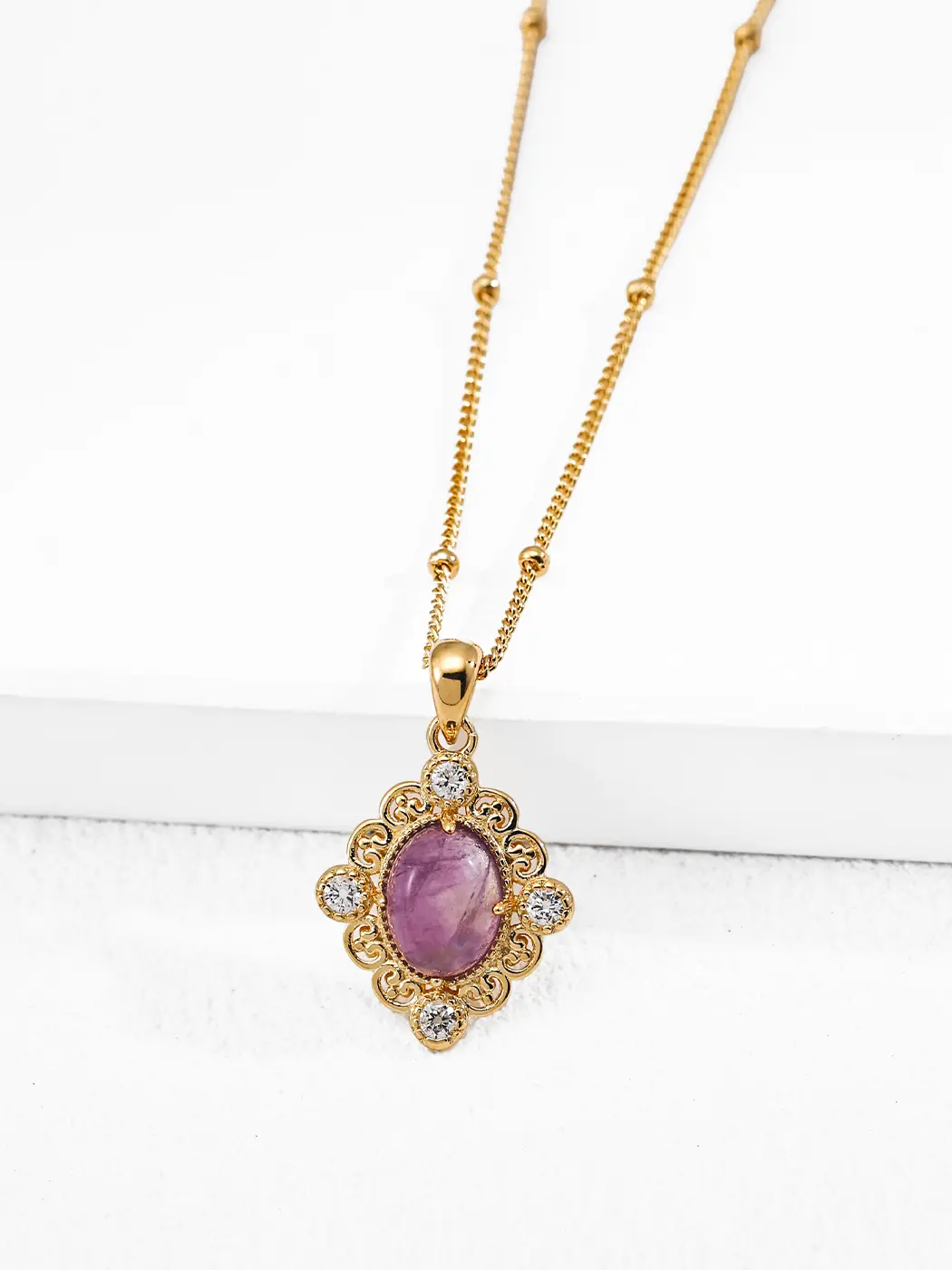 The Royal Amethyst Crest Necklace brings together vintage charm and refined elegance. The design uses a soft oval amethyst framed by ornate gold filigree. Each curve adds depth, and each zircon adds brilliance. The pendant feels regal, yet it still looks wearable for daily life. Moreover, the symmetrical crest shape creates balance and enhances the gemstone’s natural color. The chain features polished bead accents that add movement and subtle sparkle.