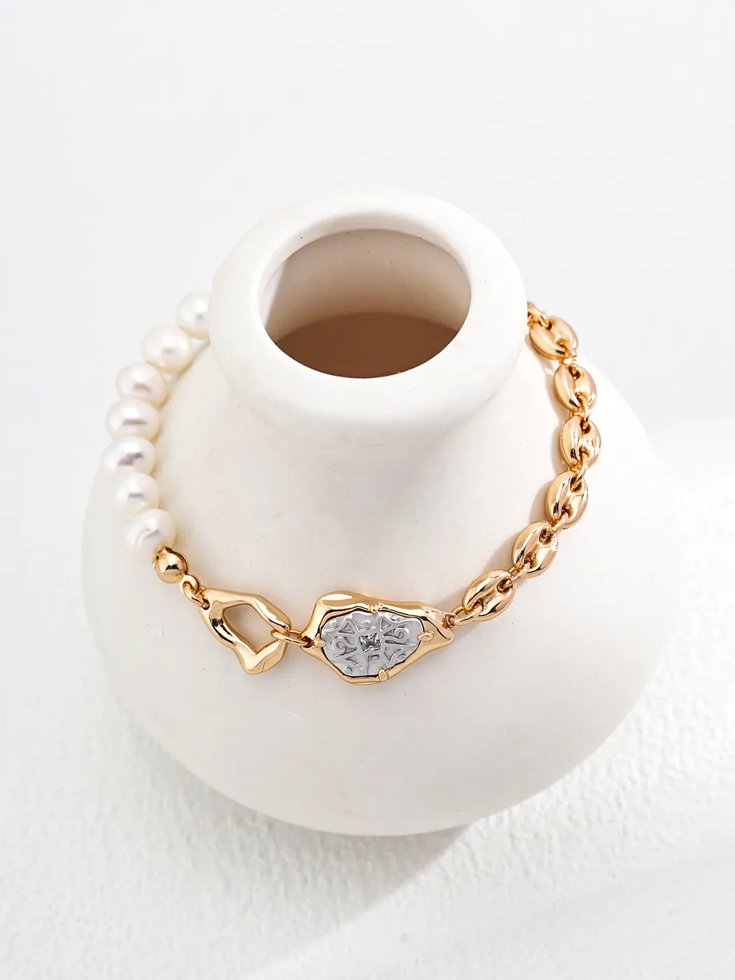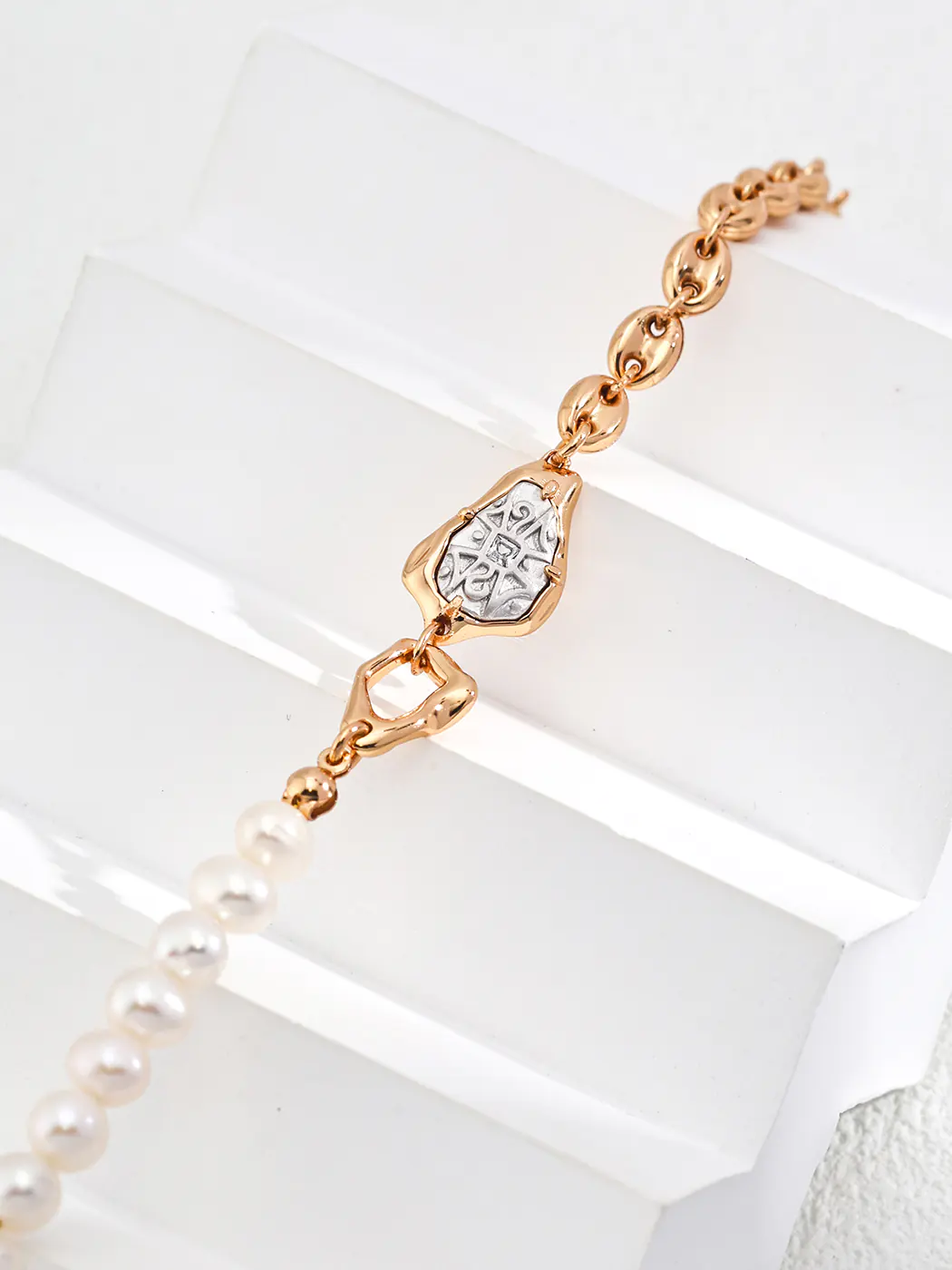 The Seal of Grace Natural Pearl Bracelet highlights sophistication with a balanced mix of pearls, silver artistry, and delicate zircon. One side of the design features luminous pearls, each measuring around 6 mm, creating a soft and elegant rhythm. The other side presents sculpted links plated in vintage gold, adding texture and contrast. At the center, a silver emblem engraved with a seal-inspired motif is framed in gold, becoming the focal point of the bracelet. With a length of 16 cm plus a 3 cm extender, it ensures comfort and adaptability. The Seal of Grace Natural Pearl Bracelet offers timeless beauty while carrying symbolic refinement.