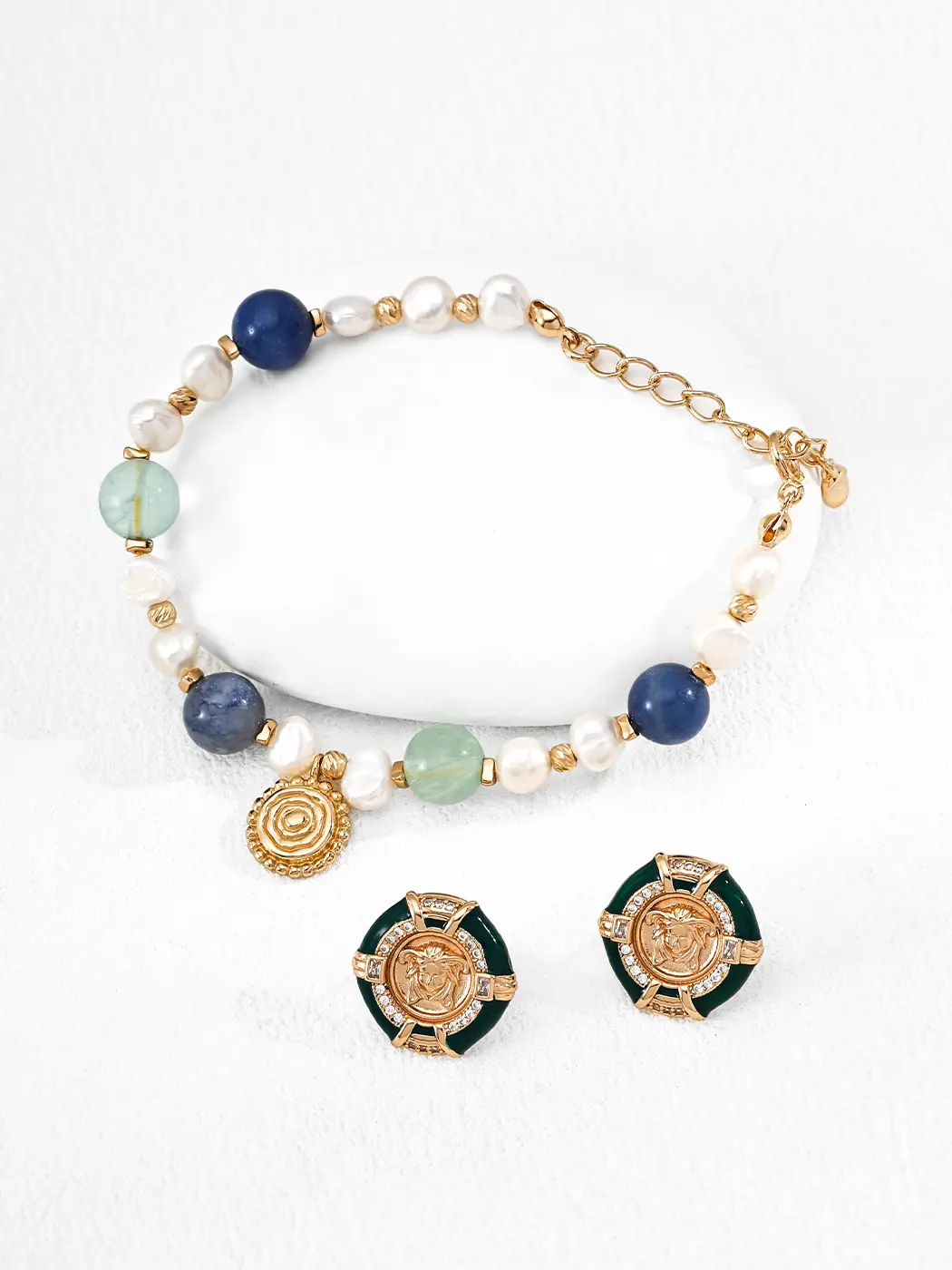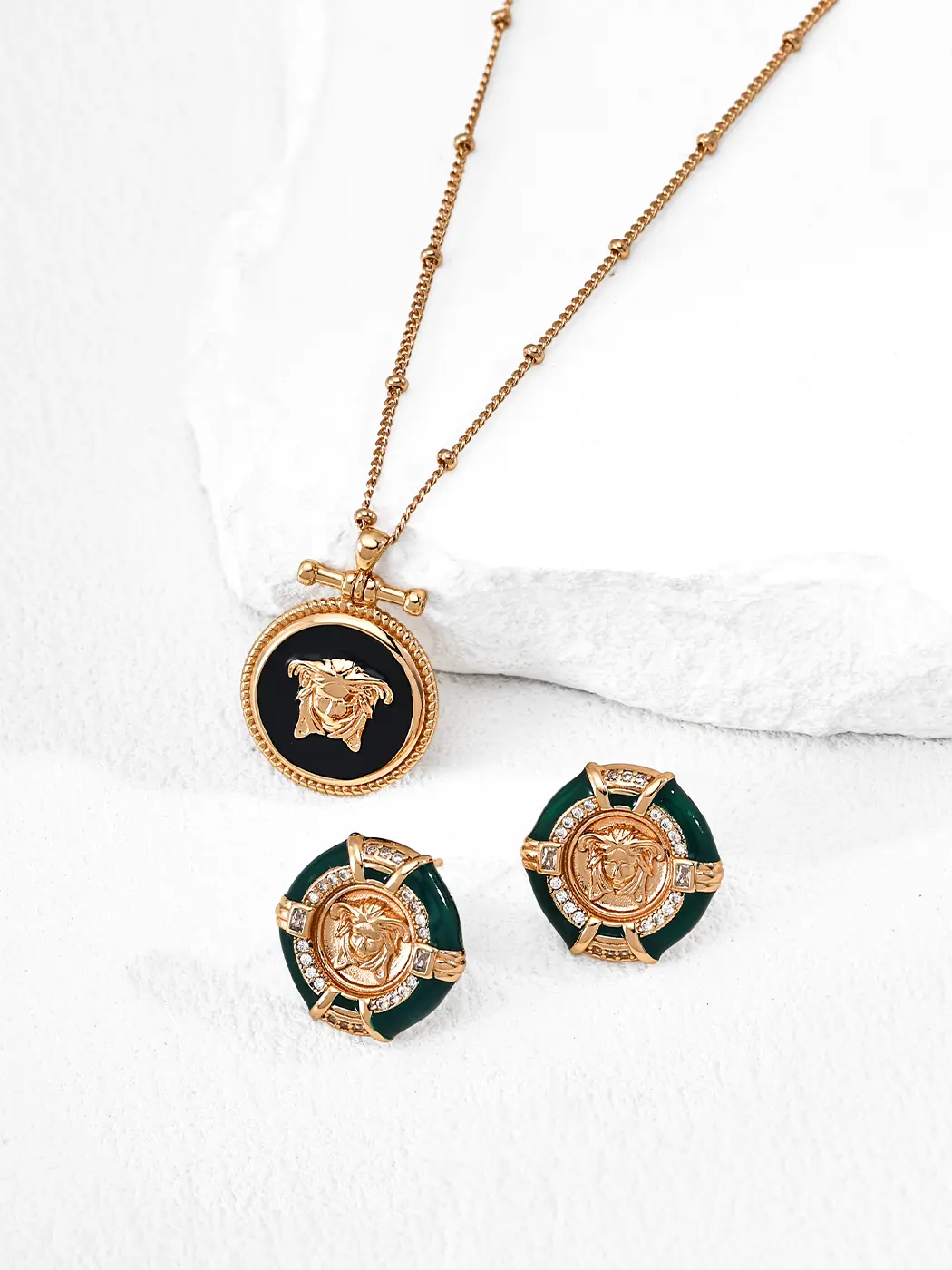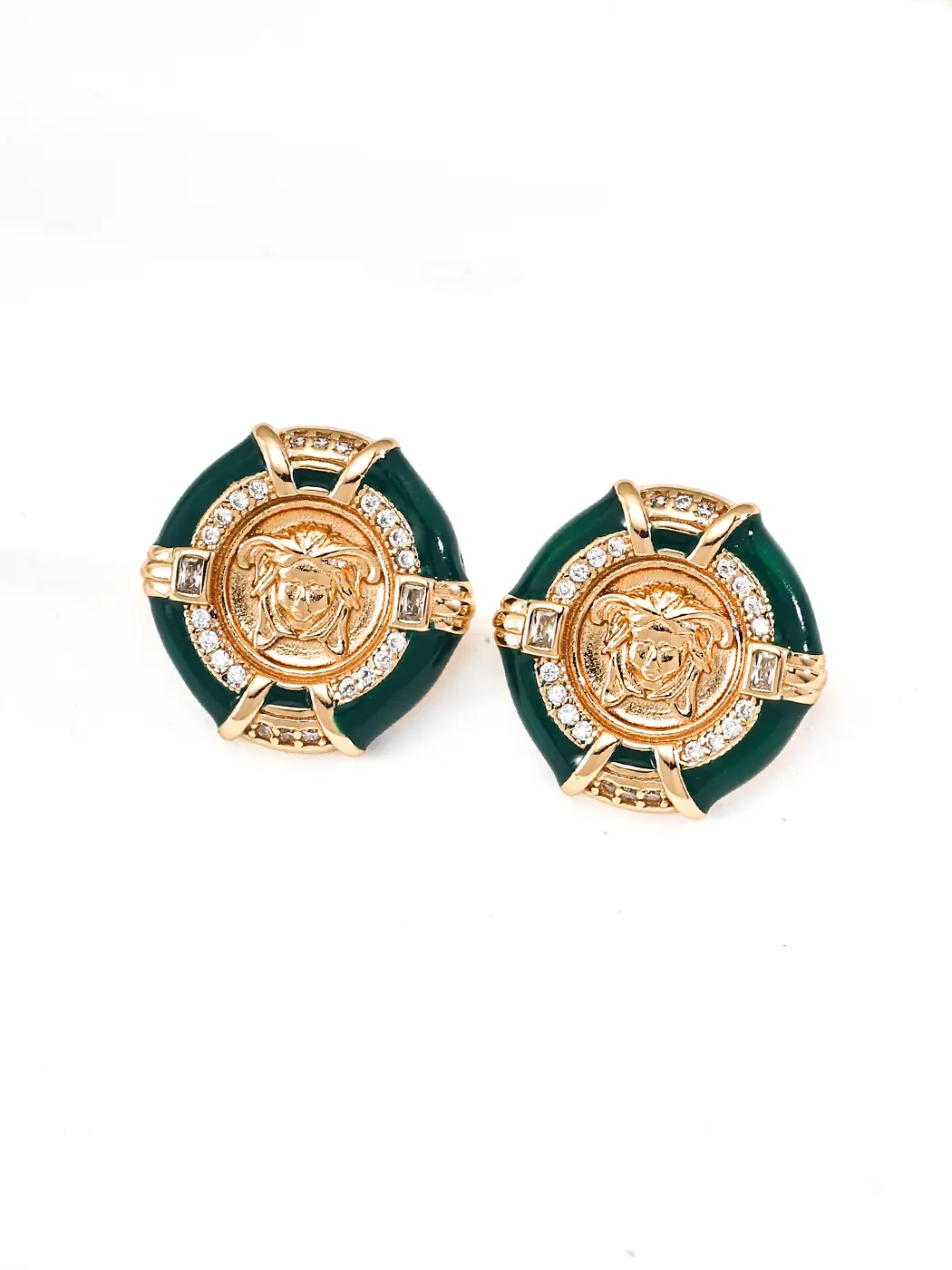For casual looks, the earrings elevate simple tops, dark knits, and fitted jackets. The green enamel adds color while staying refined. For business or evening outfits, the medallion design offers statement-level polish, and crystals catch soft light beautifully. These earrings pair well with gold necklaces, elegant bracelets, or minimal rings, and the combination creates a curated, confident look. Because the style balances vintage and modern elements, the earrings adapt easily across seasons.