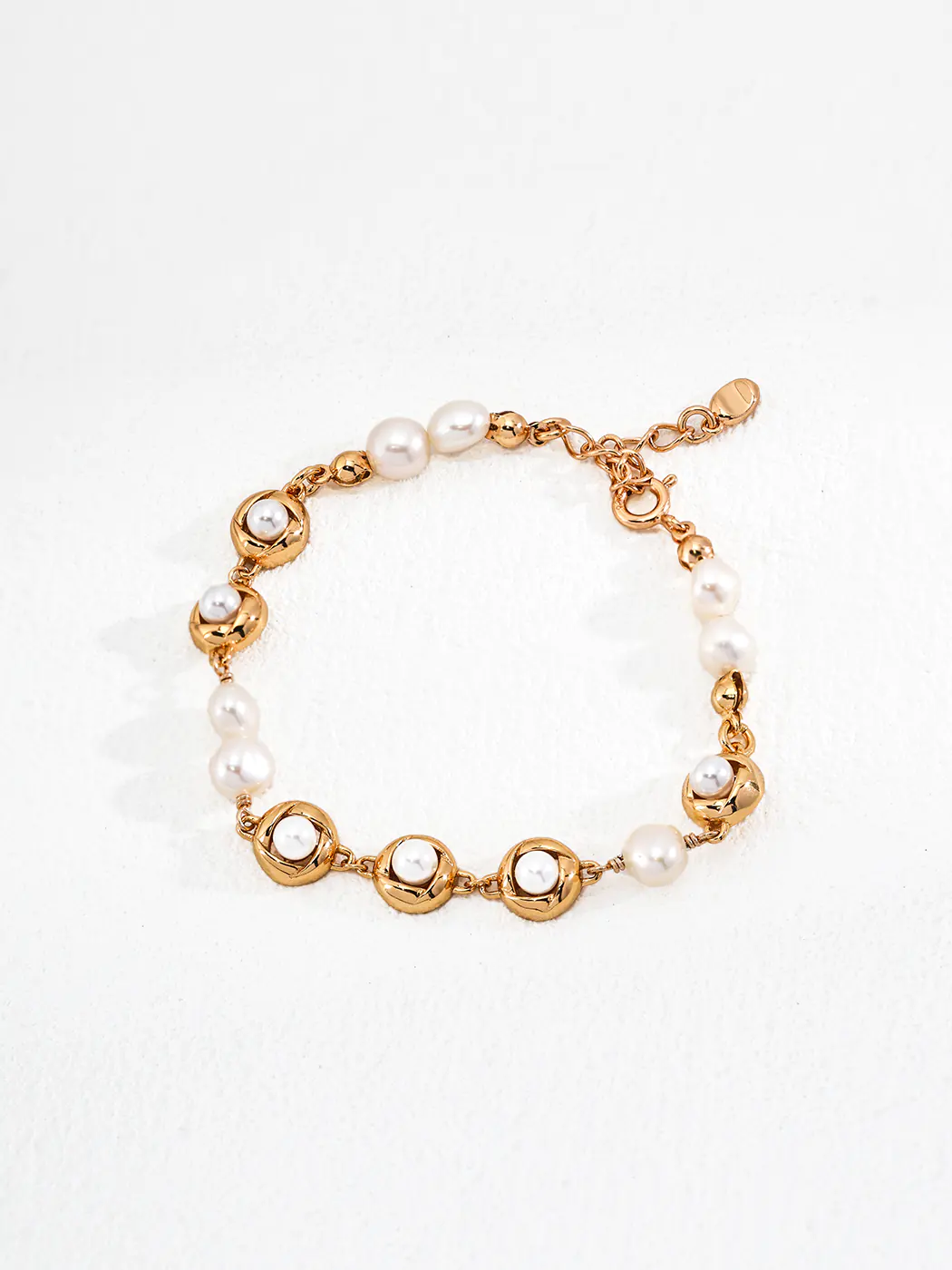 This bracelet is crafted from S925 sterling silver with an 18K vintage gold plated finish. Natural pearls add organic luster, reflecting light in soft hues of white and cream. Sculpted silver frames provide durability and structure, while the extender chain guarantees flexibility for different wrist sizes. Each component is polished with care, blending gemstone beauty with lasting craftsmanship. The materials combine to create a bracelet that is both delicate and durable.