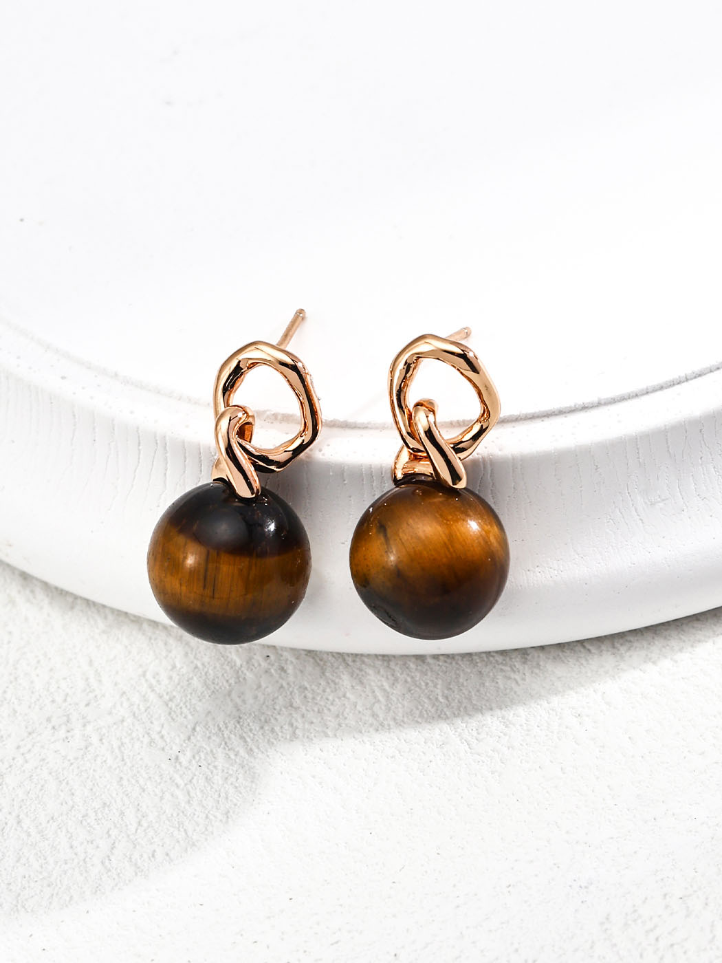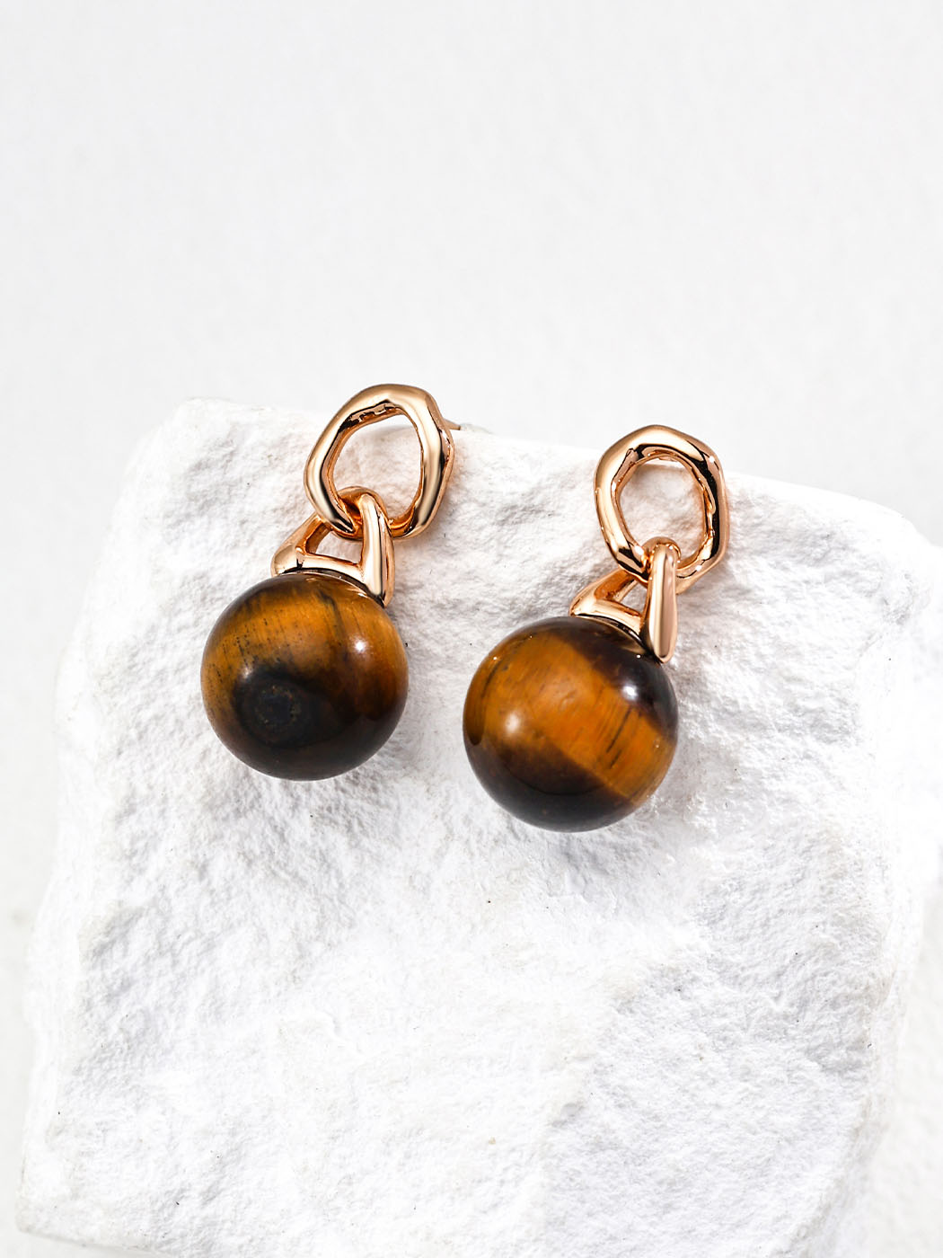 These Sphere Tiger Eye Drops showcase bold design with natural charm. Each earring features a sculptural hoop element linked to a polished tiger eye sphere. The gemstones, measuring about 1.2 cm, display golden-brown tones that shift beautifully under light. Moreover, the warm vintage gold finish enhances their depth and glow. As a result, the earrings combine organic form with refined craftsmanship. In addition, their 2.5 cm drop length provides balance between presence and elegance.