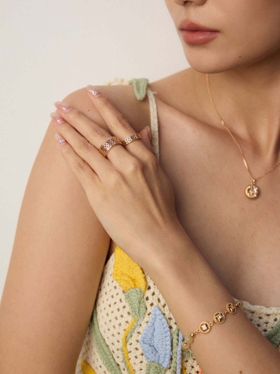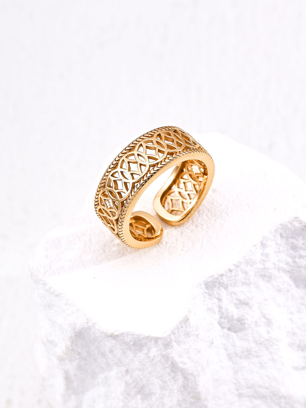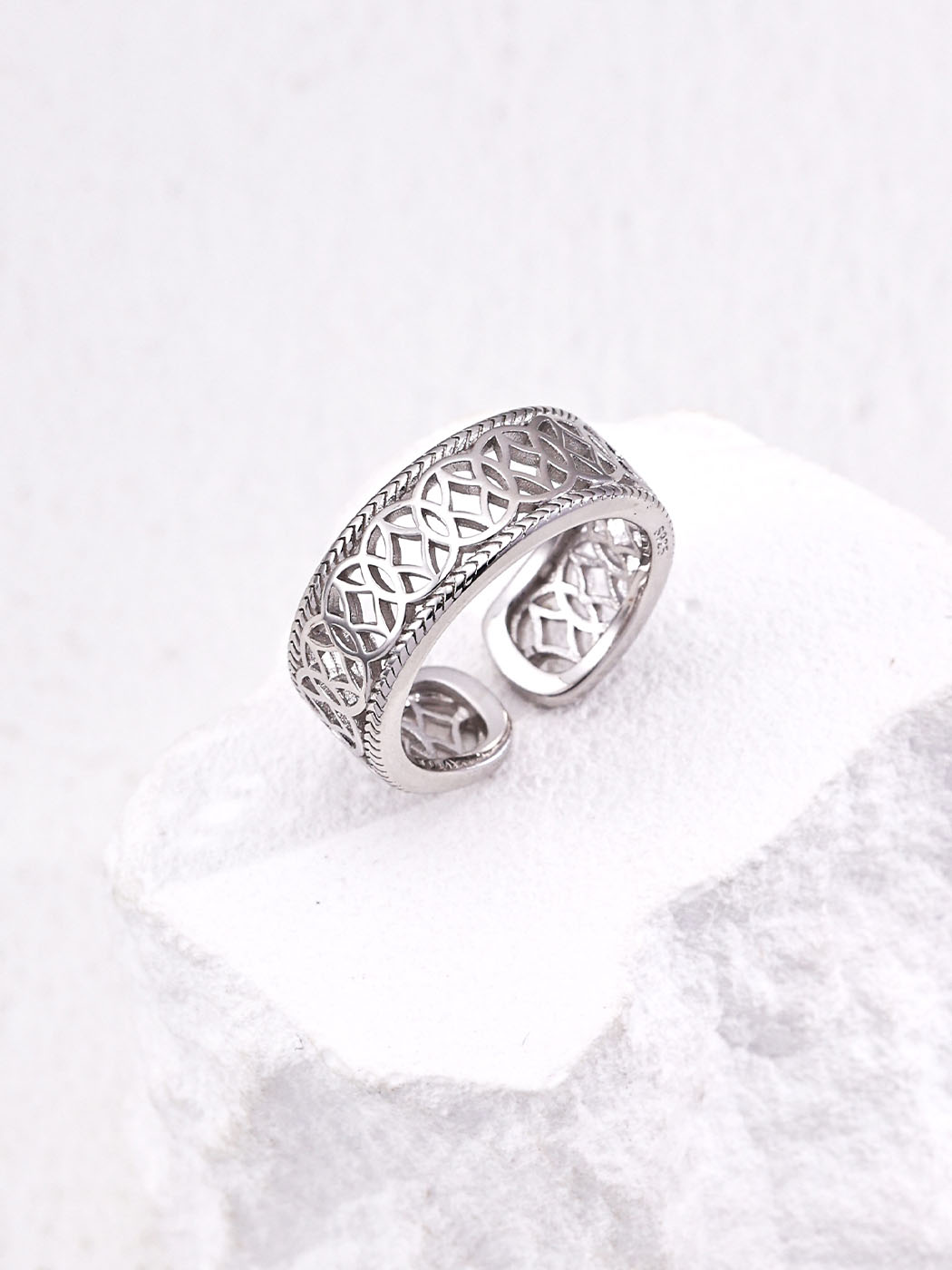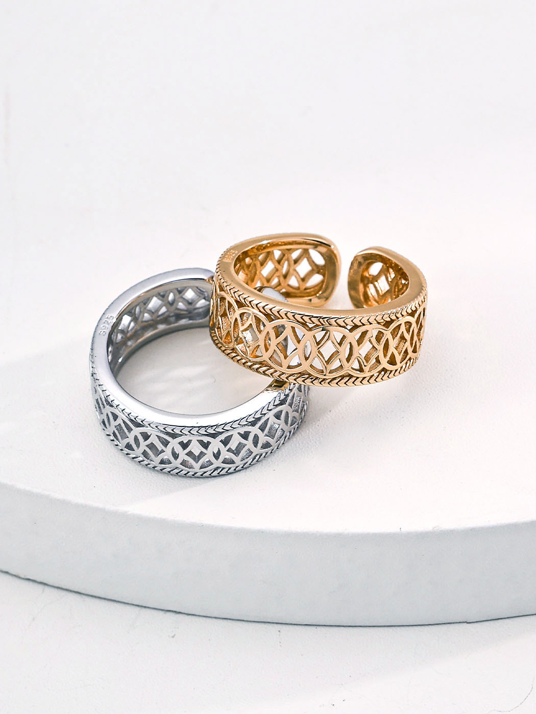 Made from high-quality 925 sterling silver, this ring combines durability with elegance. The filigree-style cutouts allow light to pass through, emphasizing the beauty of the openwork pattern. Finished in either polished silver or vintage gold plating, the design adapts easily to different personal styles. With an adjustable fit for sizes approximately 15–16, the ring ensures both comfort and versatility.