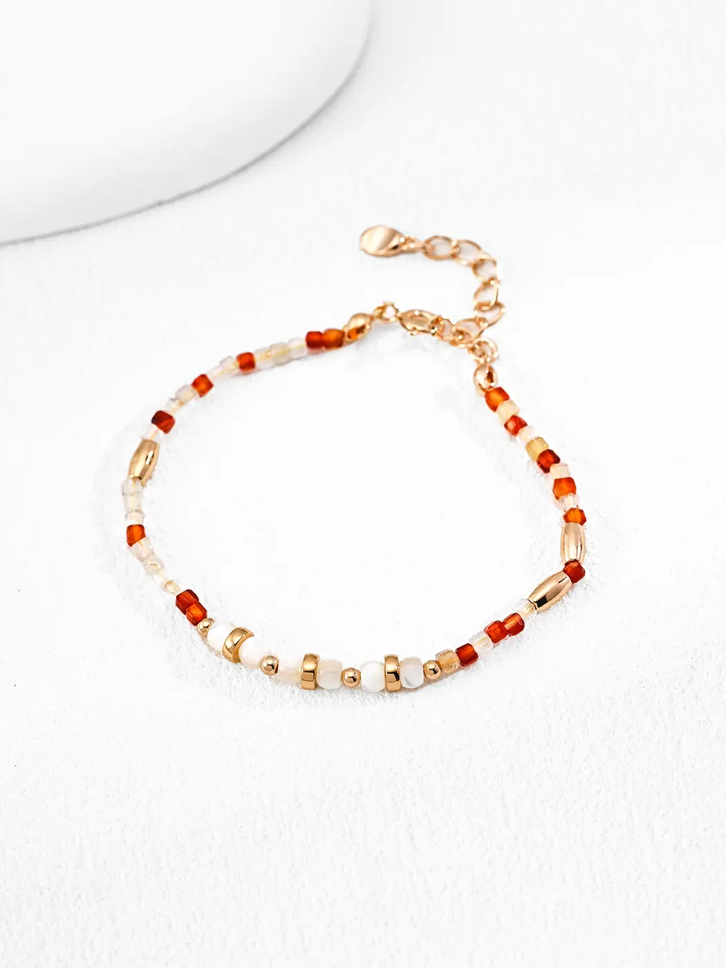 The Sunshine Warmth Agate Bracelet showcases a delicate blend of warm red agate and soft mother-of-pearl beads. Each red agate bead glows with deep, sunset-like tones, and the warm colors bring a sense of comfort. In contrast, the mother-of-pearl beads introduce gentle shimmer, and their cool brightness balances the vivid agate. Gold-toned accents sit between the beads and add structured rhythm. The 16 cm chain features a 3 cm extender, and the slender profile creates an elegant, effortless silhouette. The overall look feels light, harmonious, and quietly radiant.