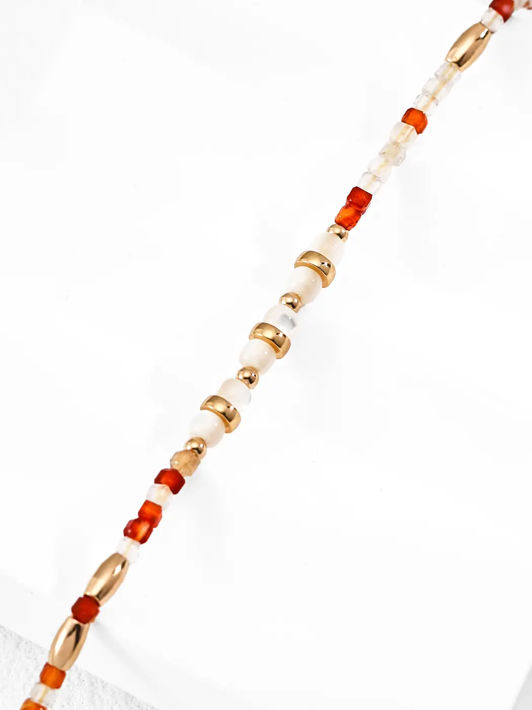 This piece combines opposing yet complementary energies. Red agate symbolizes warmth, grounding, and vitality. Mother-of-pearl represents calm, clarity, and emotional balance. Together, the two stones create harmony between movement and stillness. The Sunshine Warmth Agate Bracelet expresses this duality through its color arrangement, and the subtle transitions between beads create natural rhythm. The gold accents elevate the design and add quiet luxury. This thoughtful combination results in a bracelet that looks modern yet deeply soothing.