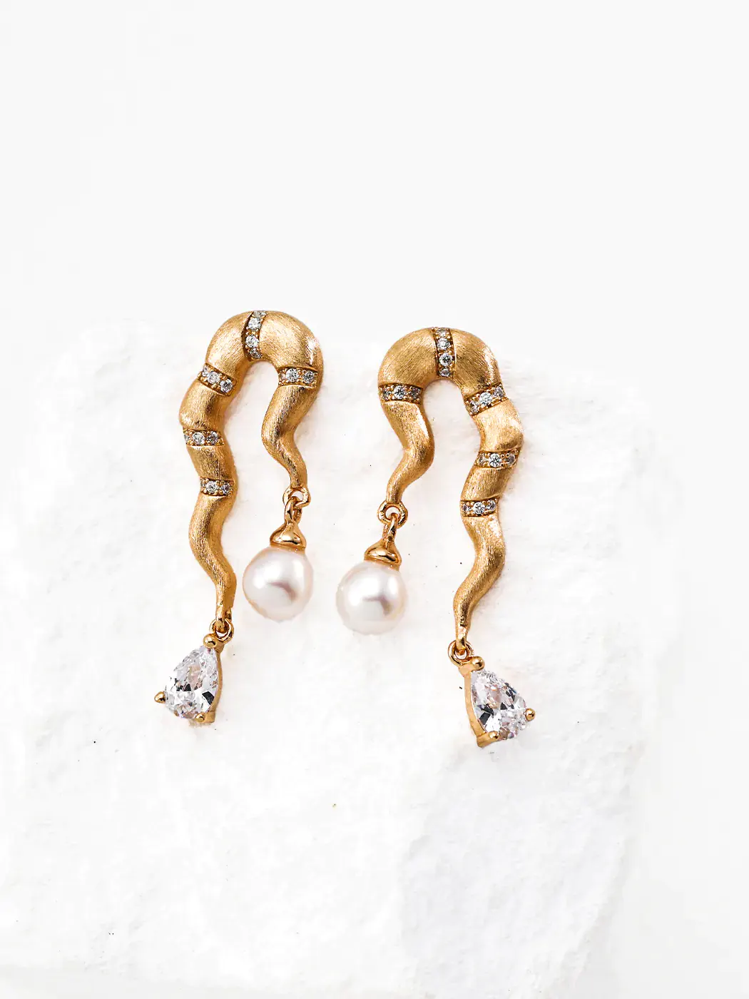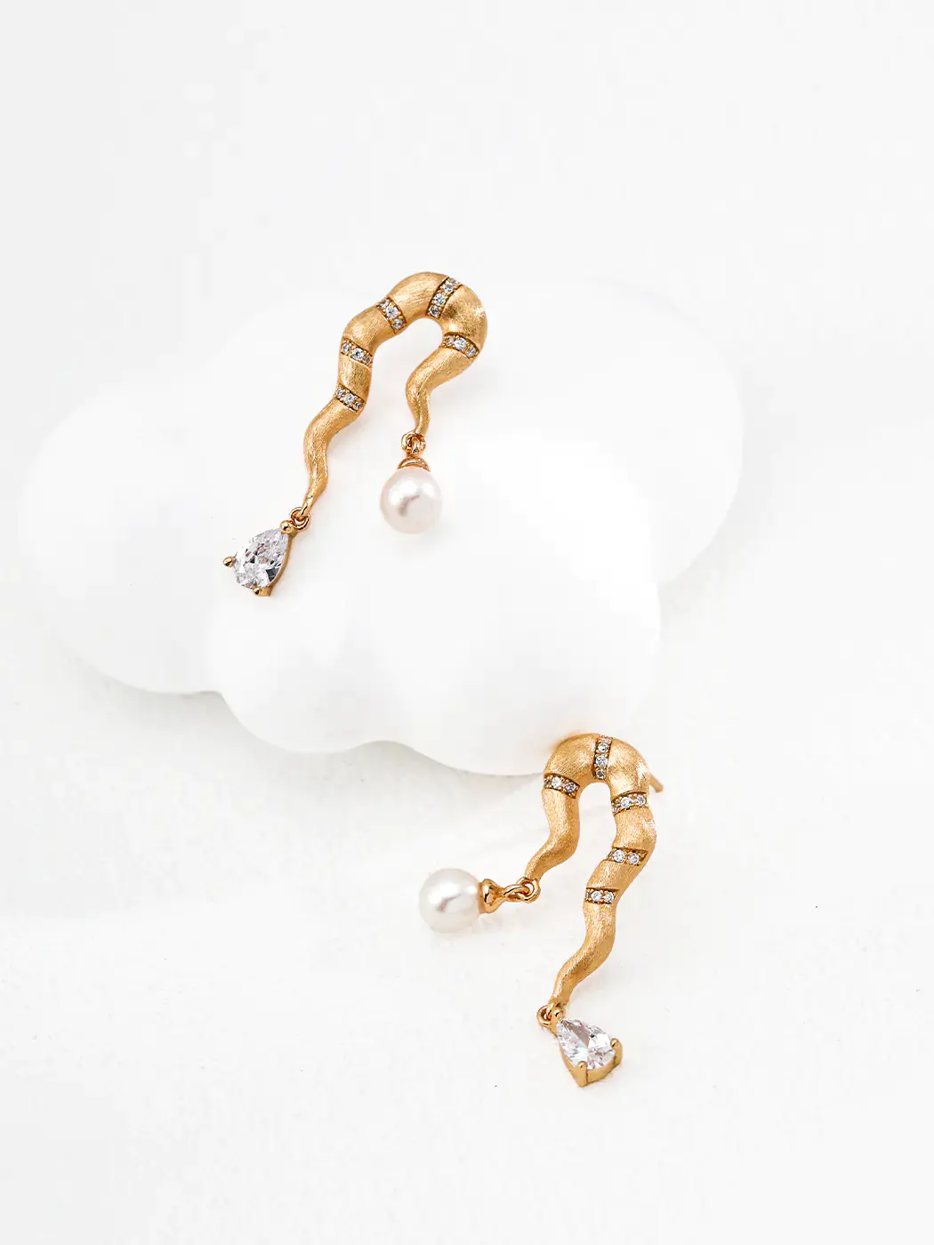 This Tarim River Natural Pearl Earring embodies flowing elegance and exotic charm. Its sculptural 3.5 cm design draws inspiration from winding river bends, resembling strands of silk hair caught in the breeze. The vintage gold-plated S925 silver frame is enhanced with sparkling cubic zirconia, while a 5 mm natural pearl and a teardrop zircon create a graceful finish. The artistic curves and delicate luster make this piece both bold and refined.