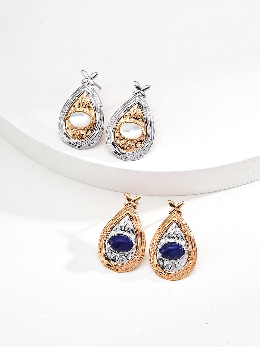 These teardrop lapis lazuli earrings combine graceful curves with intricate artistry. Each earring features a teardrop frame with delicate floral details. At the center, natural gemstones add vibrant contrast. One version glows with luminous mother of pearl, while the other shines with deep blue lapis lazuli. As a result, the design feels emotional, symbolic, and timeless.