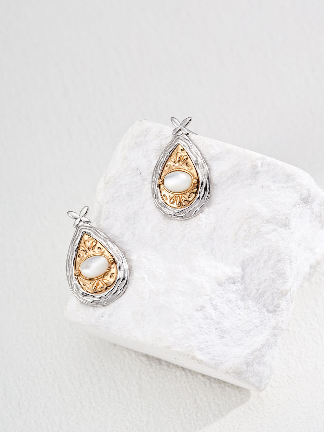 Expertly crafted from 925 sterling silver, these earrings showcase mixed finishes of vintage gold and polished silver. The central stones, measuring about 4×6 mm, offer natural brilliance. Mother of pearl reflects soft iridescence, while lapis lazuli reveals celestial blue speckled with golden tones. Therefore, each material enhances both elegance and meaning.