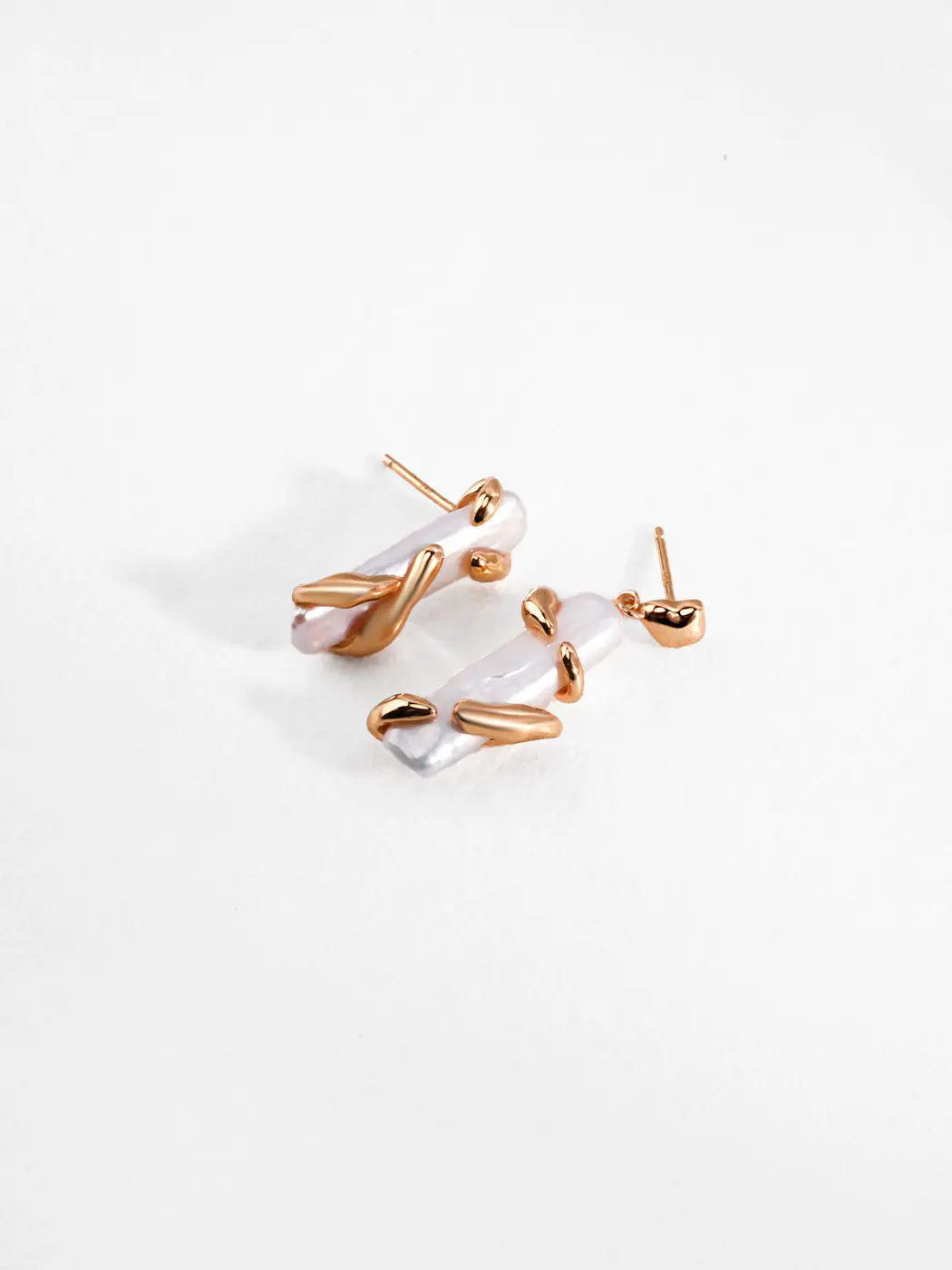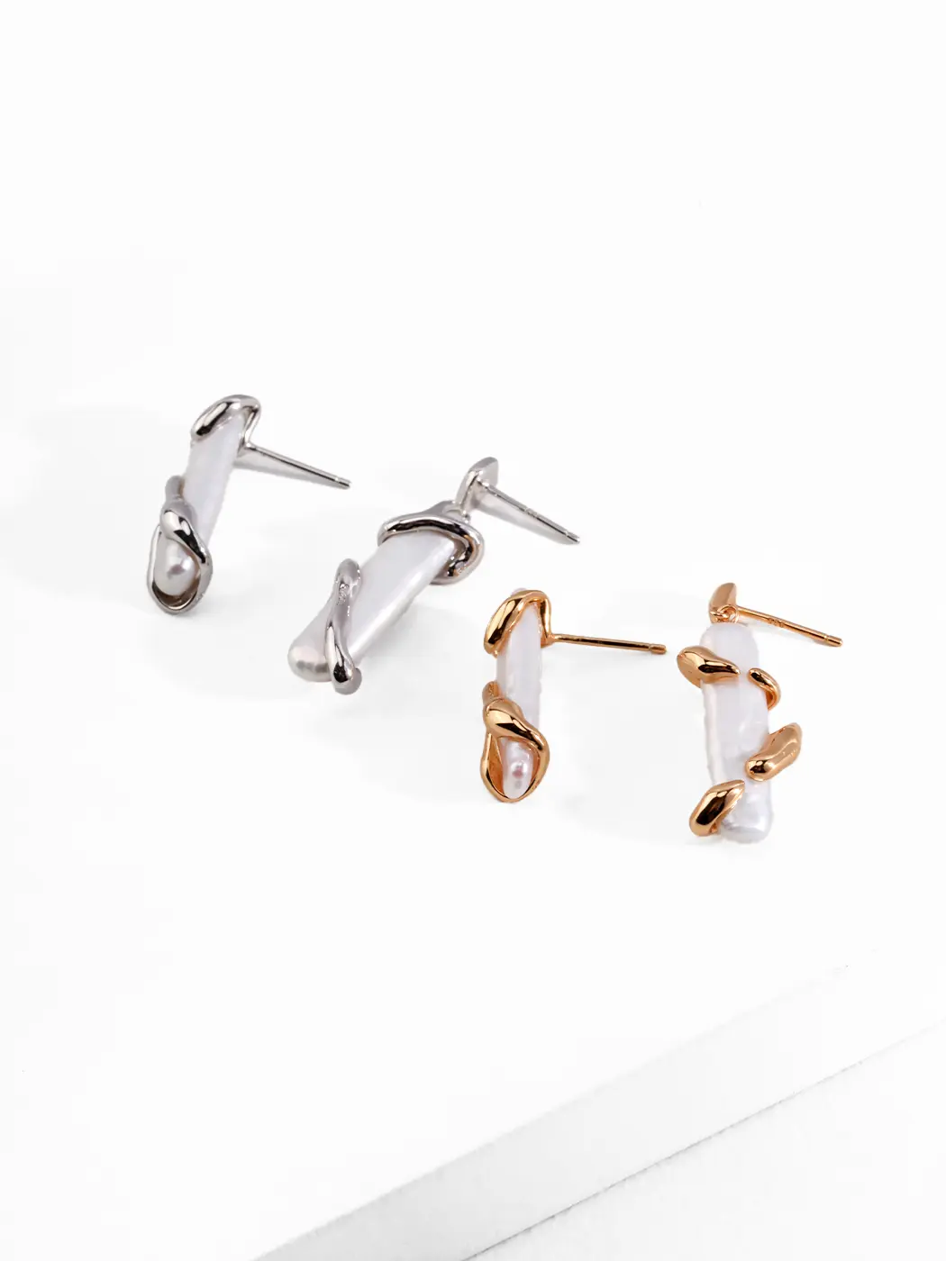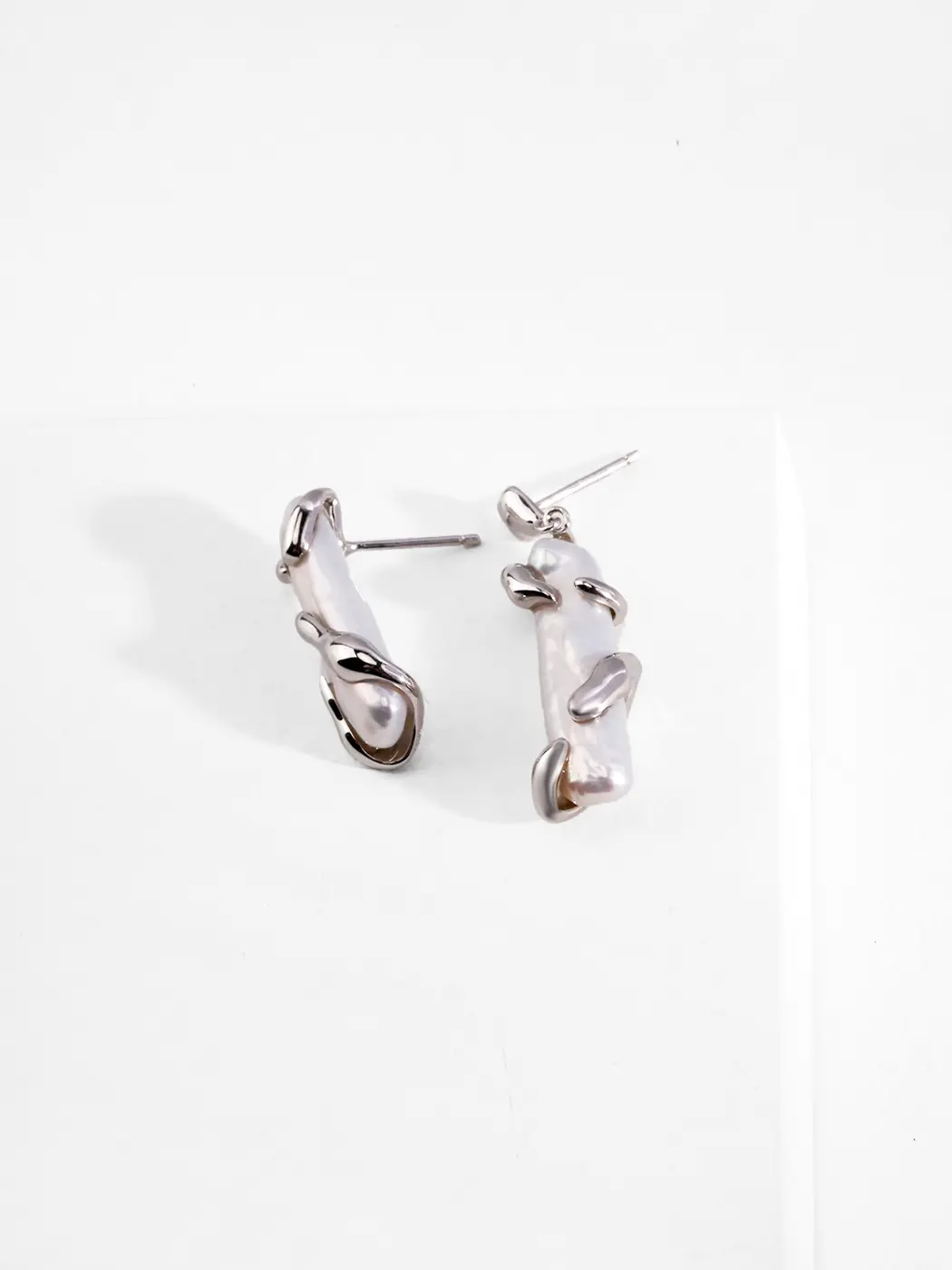 These earrings use S925 sterling silver for strength and purity. The metal supports each natural baroque pearl firmly, and the organic pearl surfaces shimmer with soft iridescence. Furthermore, the irregular gold or silver shapes add dimension that enhances the pearl’s natural glow. The pearls measure around 6 mm, and the earrings remain lightweight for daily comfort.