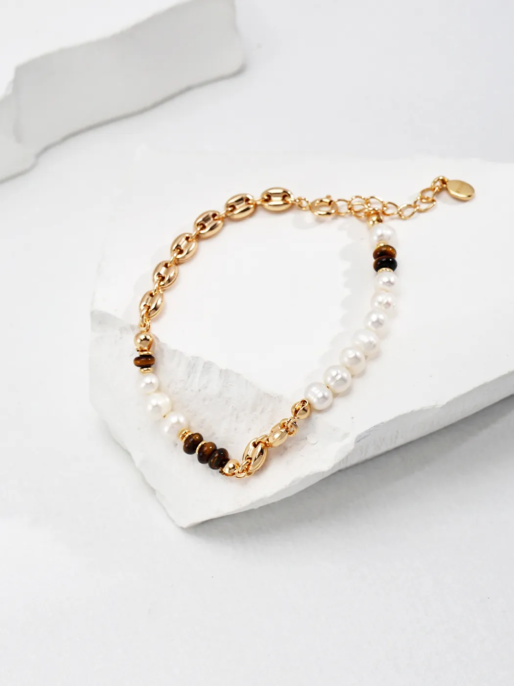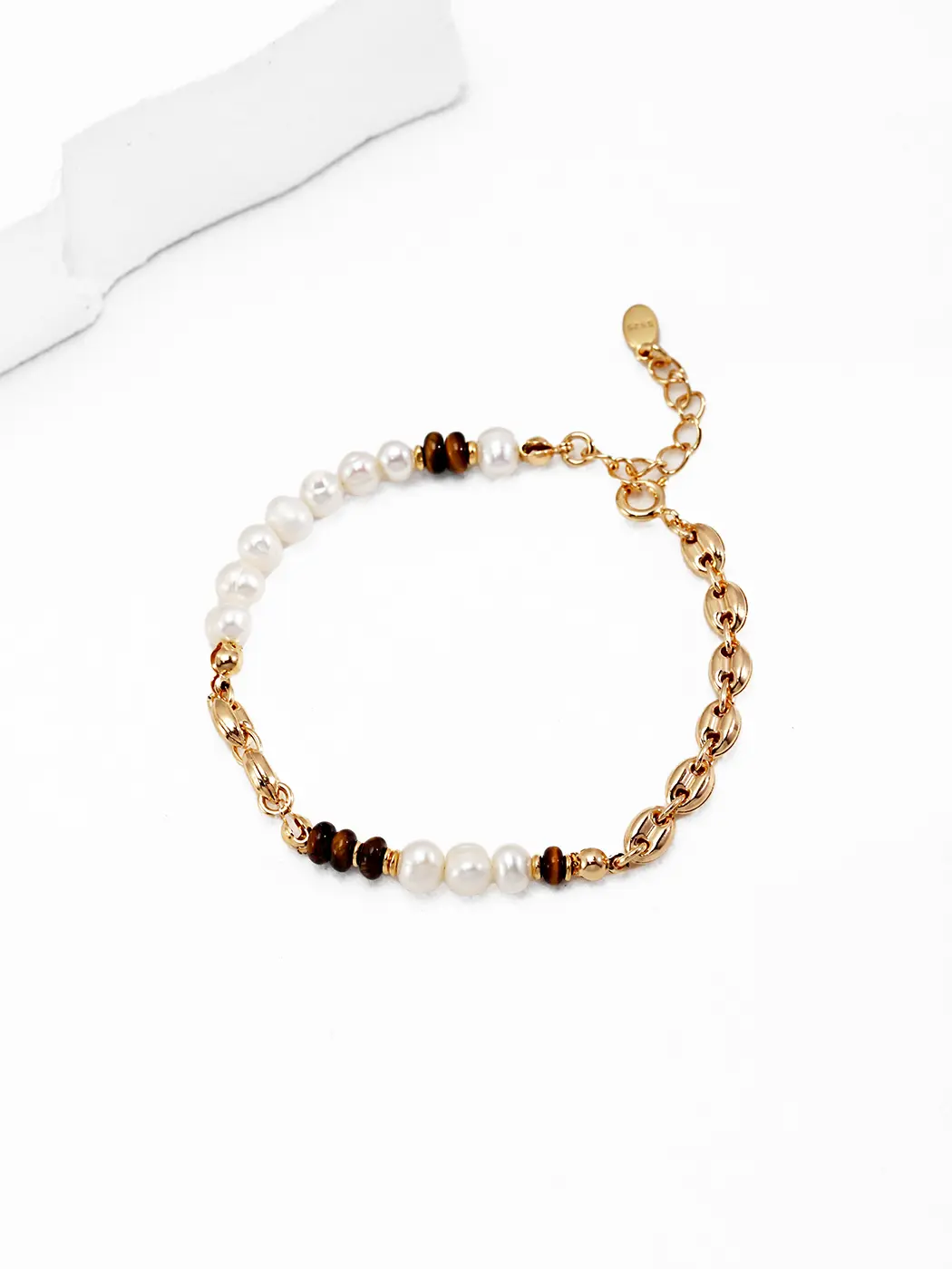 This tiger eye pearl bracelet alternates between lustrous 5–5.8 mm natural pearls and warm, shimmering 4.5–5 mm tiger eye stones. The vintage 18K gold plated finish on the S925 silver chain enhances the natural contrast of pearls and tiger eye. The balanced interplay of textures gives it both elegance and a modern edge.