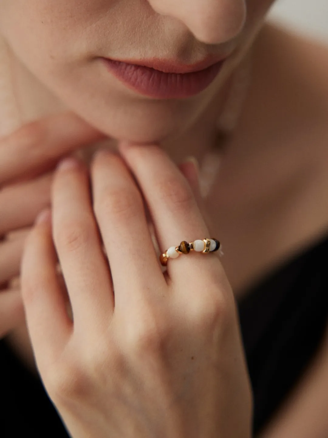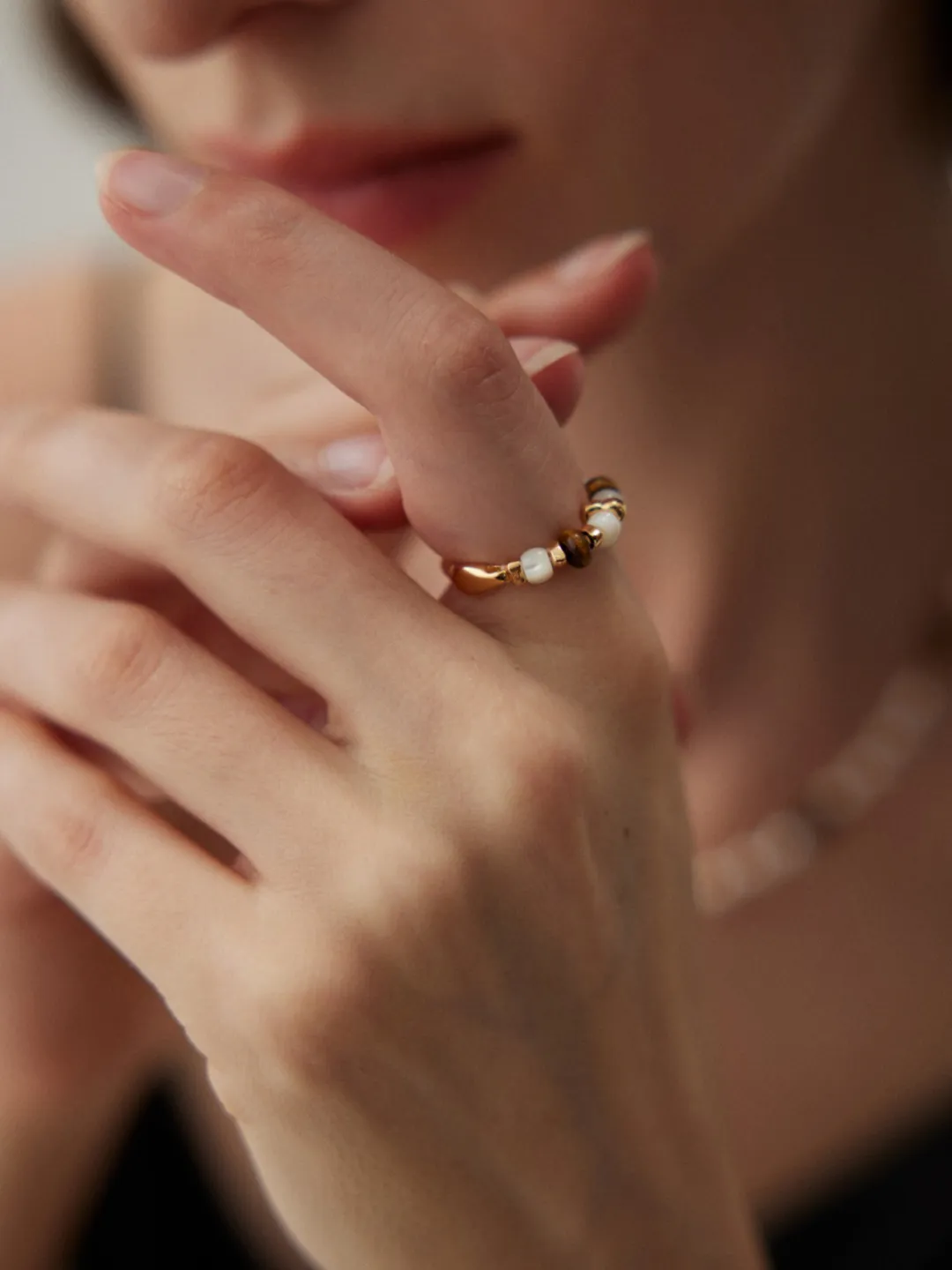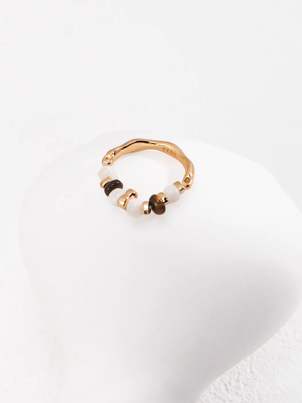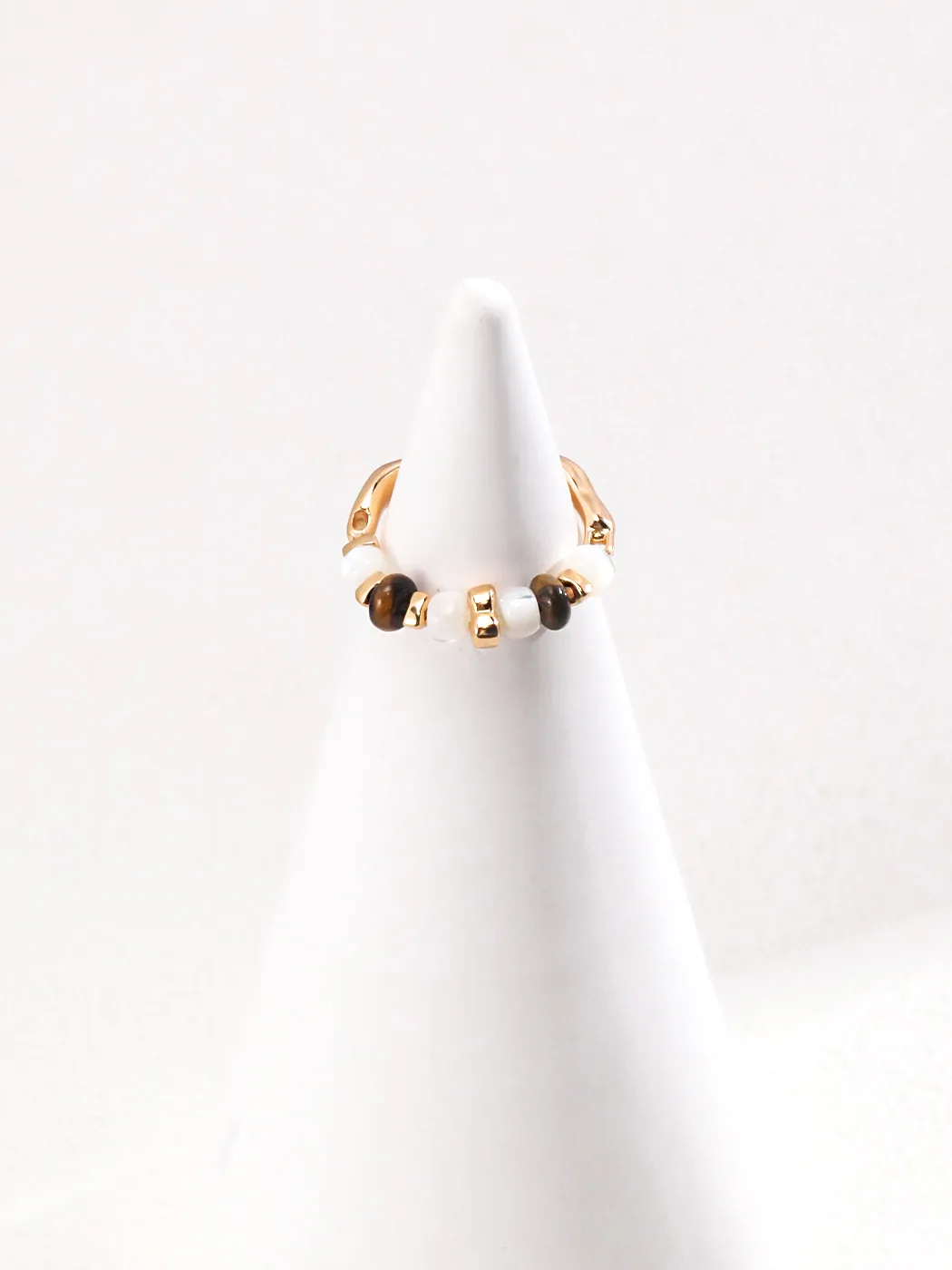 This tiger eye ring combines natural gemstones with artistic metalwork for a design that feels both earthy and elegant. The band is plated in warm vintage gold and shaped with subtle organic curves. Along the top, alternating 4.5 mm tiger eye stones and lustrous silver shell beads are set in sequence, highlighted with polished gold spacers. The contrast between the deep golden-brown glow of tiger eye and the soft iridescence of silver shell creates a refined balance. This tiger eye ring adds a touch of natural sophistication to any jewelry collection.