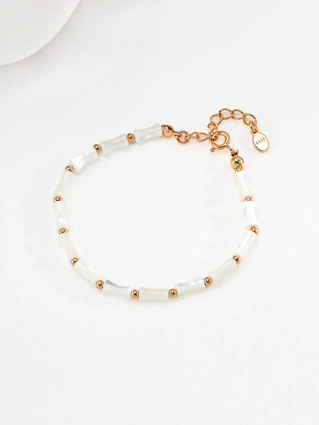 This bracelet is crafted from S925 sterling silver, known for its brilliance and lasting quality. An 18K gold finish highlights the structure, adding a timeless glow. Natural horse conch shell beads, each about 4 × 7 mm, bring organic luster and unique character. Their gentle curves and polished surface reflect subtle tones of cream and white. The chain measures 16 cm with a 3 cm extender, allowing easy adjustment for different wrist sizes. The careful combination of shell, silver, and gold results in a bracelet that feels both durable and refined.