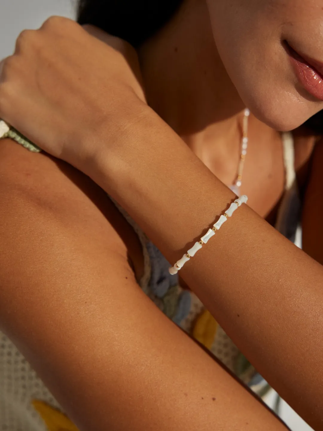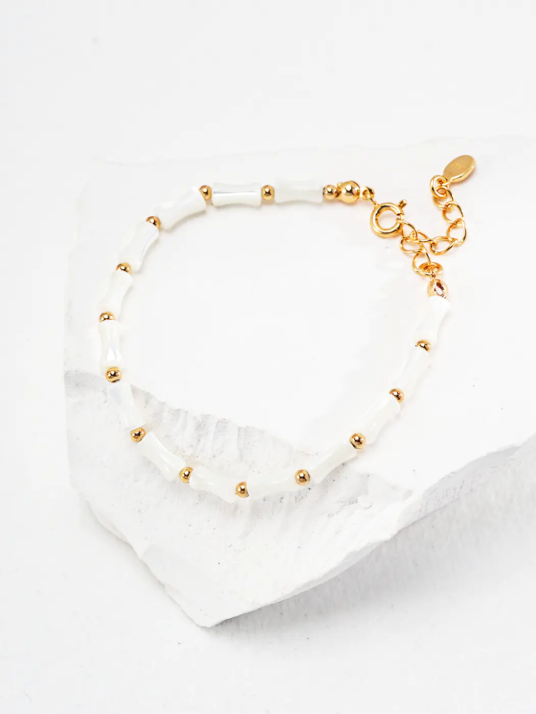 The Tranquil Bamboo Bracelet takes inspiration from nature with its graceful bamboo design. Each bead, shaped from horse conch shell, shines with a soft iridescent glow. The subtle shimmer of white and cream reflects light beautifully, giving the bracelet a calm yet refined presence. Between every shell piece, tiny gold-plated beads add warmth and rhythm. The balanced pattern creates harmony, while the smooth 18K gold clasp completes the look. From the first glance, the bracelet feels serene, elegant, and quietly distinctive.