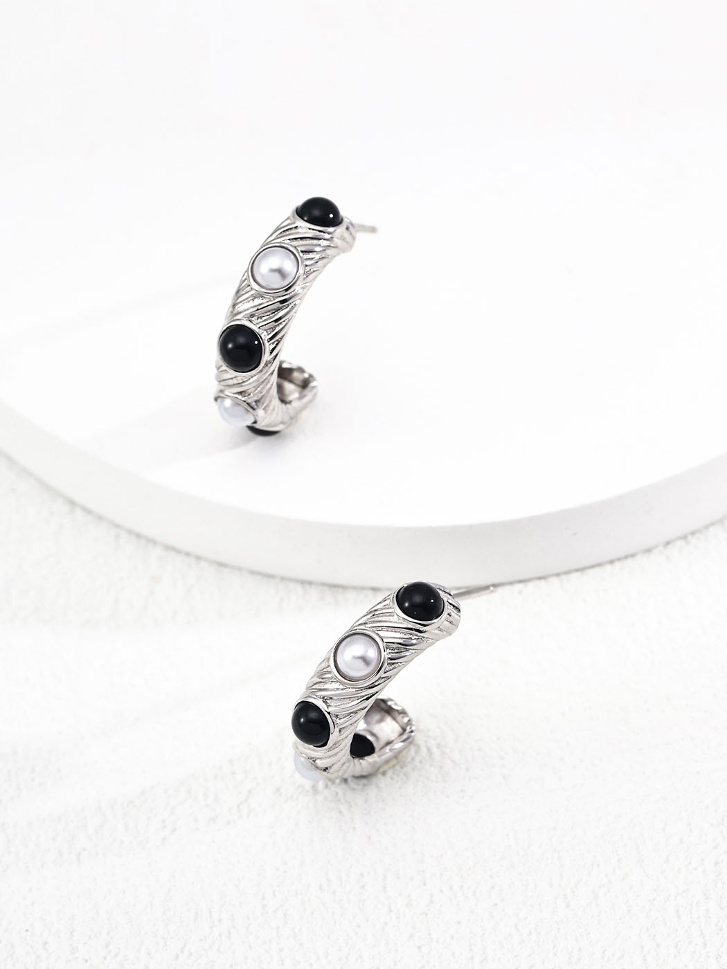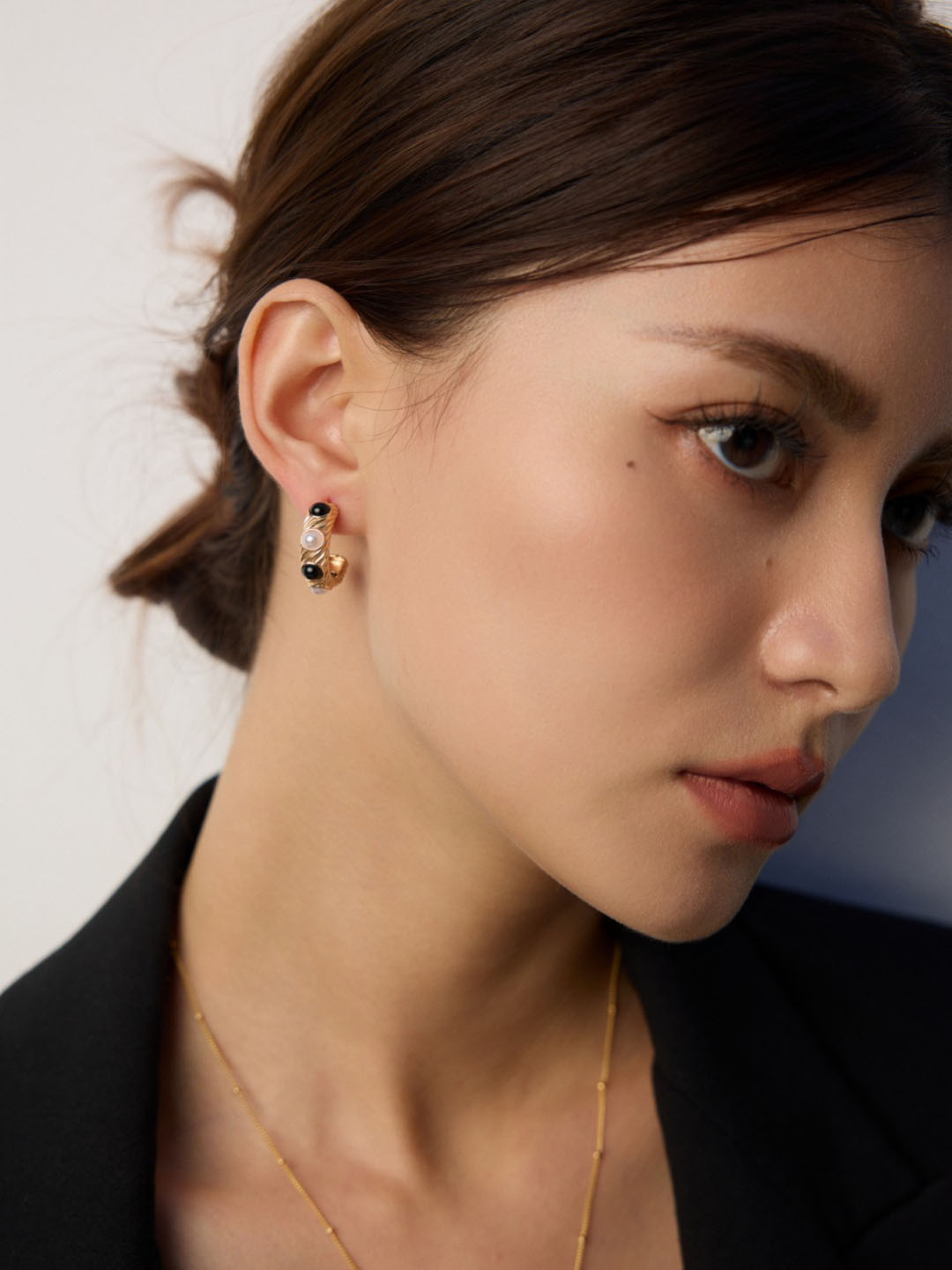 For casual wear, pair these hoops with monochrome outfits to highlight their contrasting gems. Additionally, in professional settings, they add sophistication when styled with tailored blazers or crisp shirts. During evenings, the interplay of pearl glow and onyx depth enhances sleek gowns or darker fabrics. Furthermore, they layer beautifully with pearl bracelets, gemstone rings, or minimalist silver chains. Because of their versatile structure, they adapt seamlessly from daytime refinement to evening elegance.