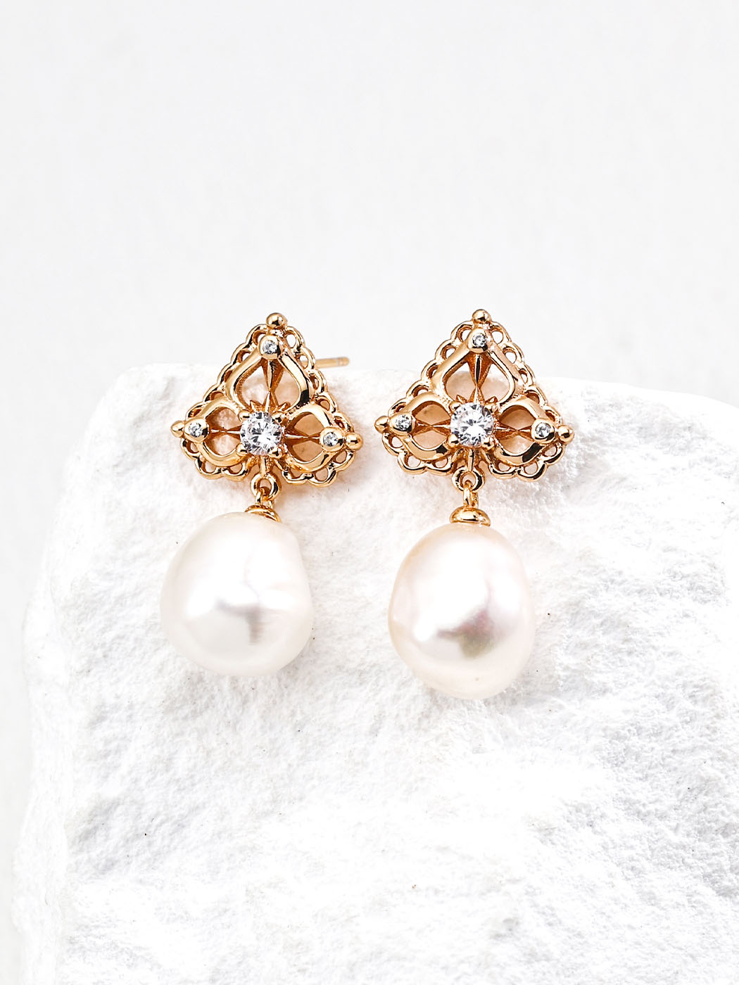 The Victoria Crown Pearl Drops earrings combine royal elegance with natural beauty. Each earring features a crown-inspired filigree top set with sparkling zircon stones. Moreover, the design flows into luminous natural pearls, creating a refined contrast between intricate metalwork and organic shapes. As a result, these earrings feel regal yet graceful, perfect for adding sophistication to any outfit. Their silhouette is bold but balanced, with the pearls swaying gently to catch the light.