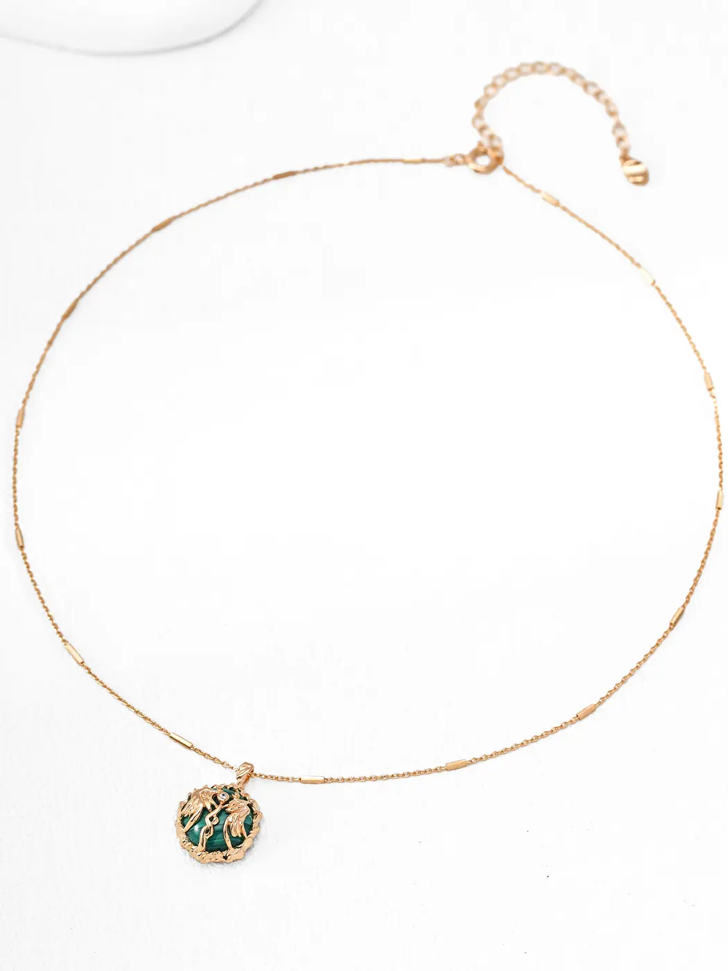 The Victory Arrow Malachite Necklace displays a bold, myth-inspired pendant with striking contrast. The design shows wing-like shapes that frame the center stone and create a sense of upward motion. The malachite reveals dark and light green bands that shift softly with movement. A small zircon sits between the sculpted wings and adds bright sparkle. The textured frame enhances the dramatic look, and the warm gold tone brings balance. The necklace uses a refined chain with structured links for added rhythm. Together, these details create a pendant that feels powerful, artistic, and full of direction.
