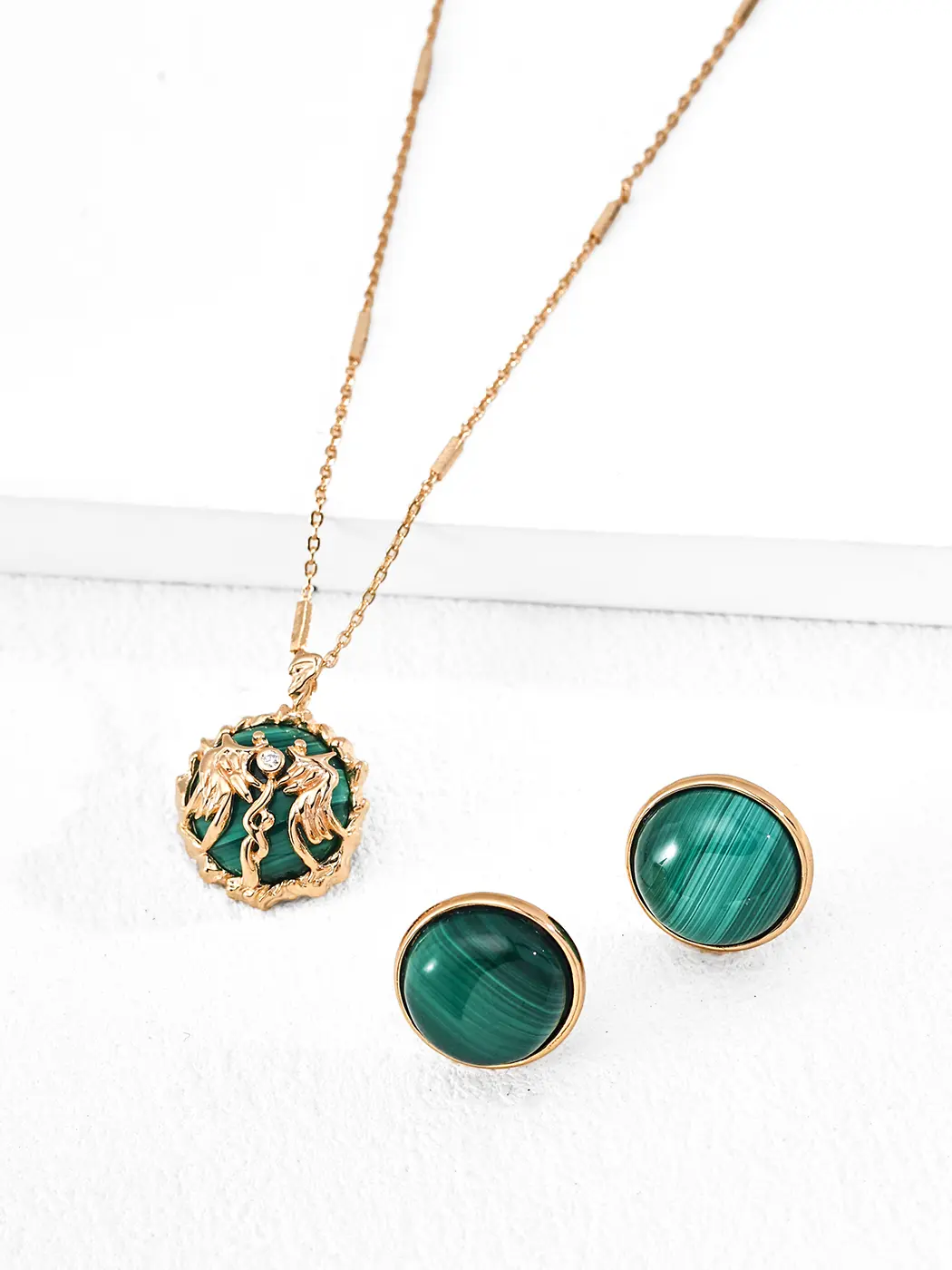 Wear this necklace with simple tops to highlight the bold malachite tones. Additionally, pair it with dark sweaters or structured jackets for dramatic contrast. The vintage green works well with gold accessories and natural textures. Layer it with thin chains for a curated look. Moreover, pair it with small studs to keep the focus on the pendant.