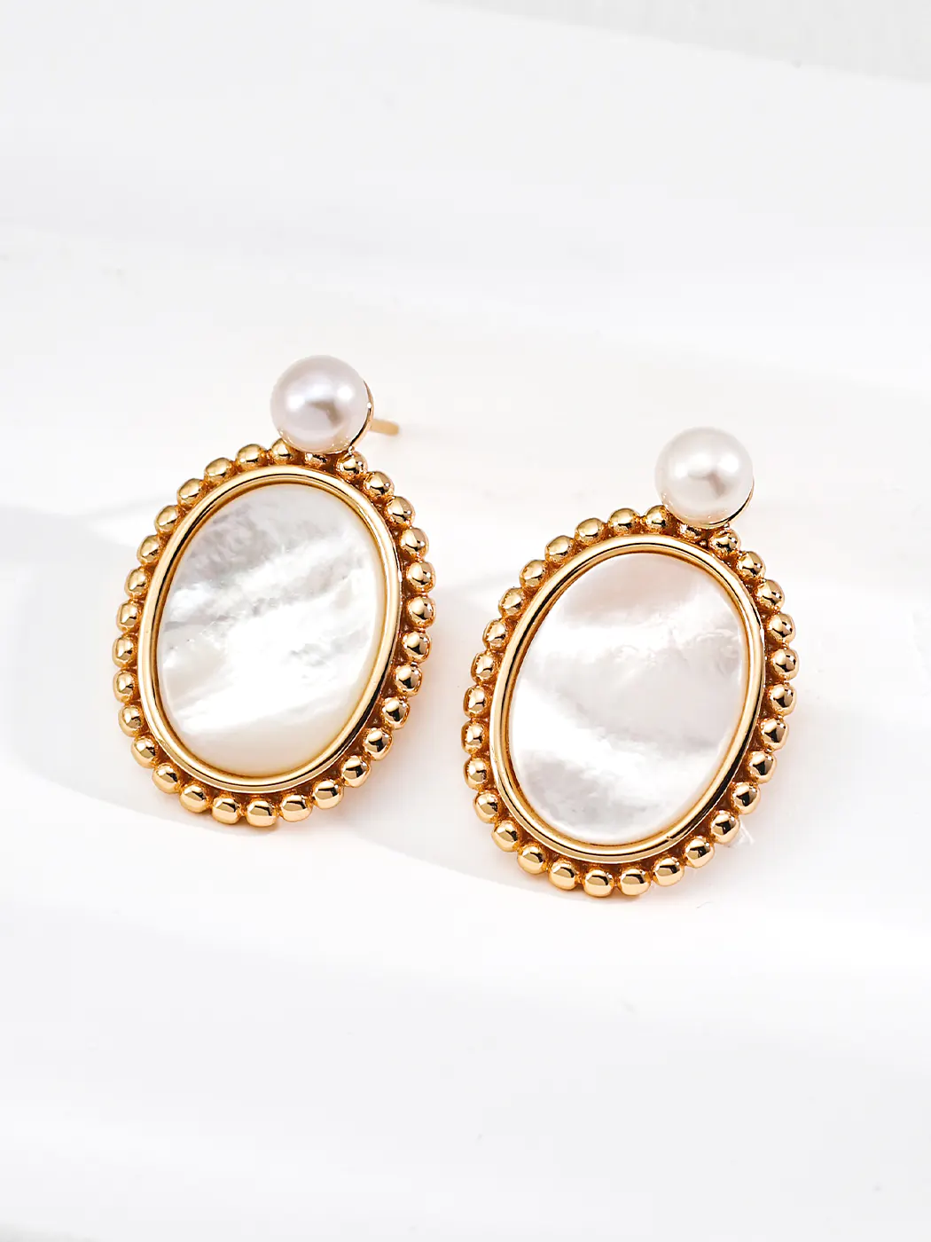 For casual wear, pair these earrings with linen shirts or simple dresses to add vintage charm. In professional settings, the design complements tailored blazers or structured tops, offering a refined accent. For evening occasions, the iridescent mother-of-pearl and luminous pearls enhance satin gowns or cocktail dresses. Moreover, the beaded frame adds texture that pairs well with layered gold or silver jewelry. Similarly, you can combine them with pearl necklaces for a cohesive, elegant look.