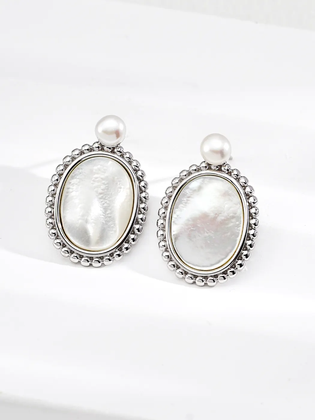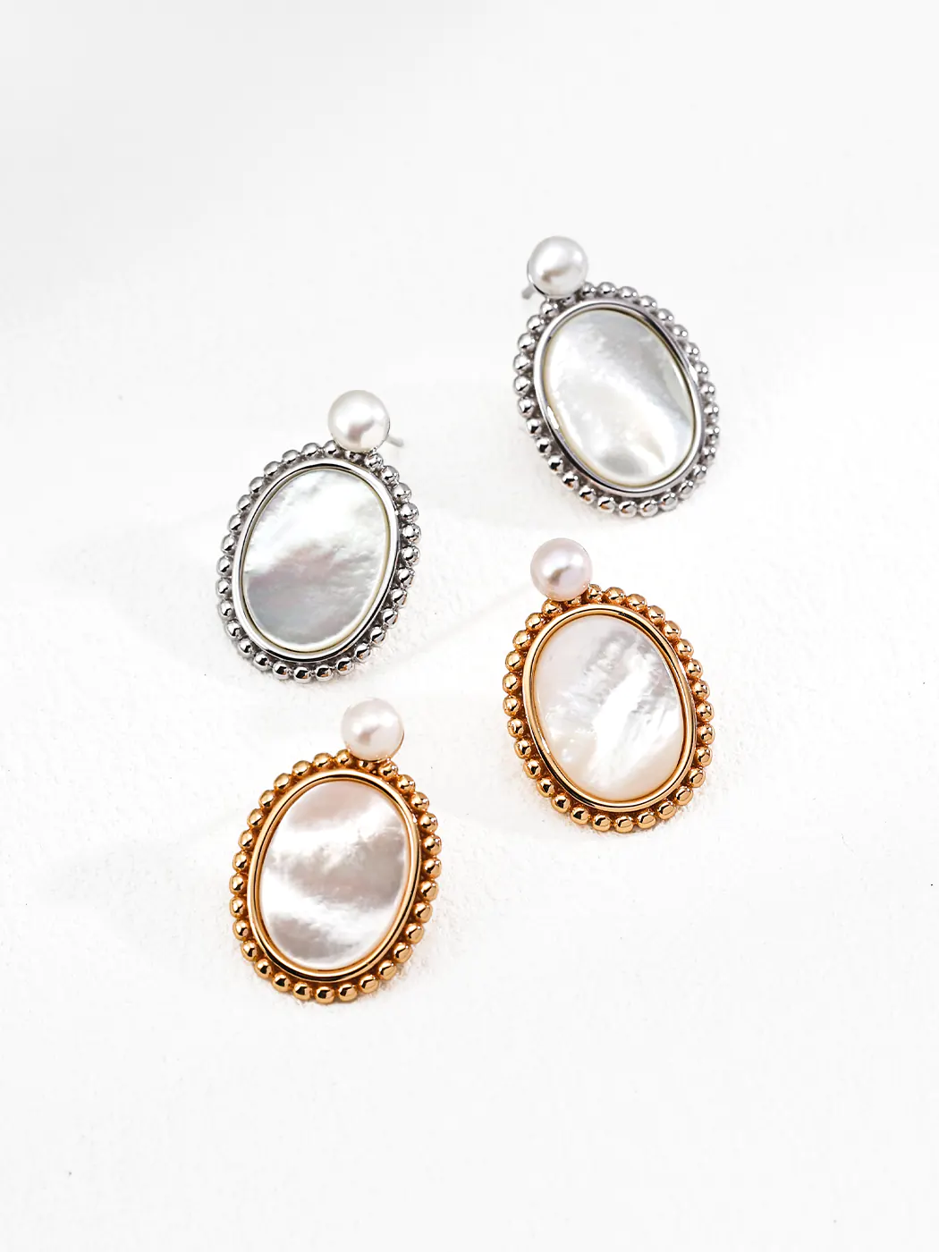 The Vintage Mirror Drops combine elegance with vintage charm through a bold oval silhouette. Each earring displays a polished mother-of-pearl centerpiece framed by delicate silver or gold beaded edges. Above the oval, a luminous 5 mm natural pearl completes the design. Moreover, the reflective sheen of mother-of-pearl creates a mirror-like effect, enhancing the sophistication. Therefore, the earrings present a refined look that works beautifully for both modern and classic outfits.