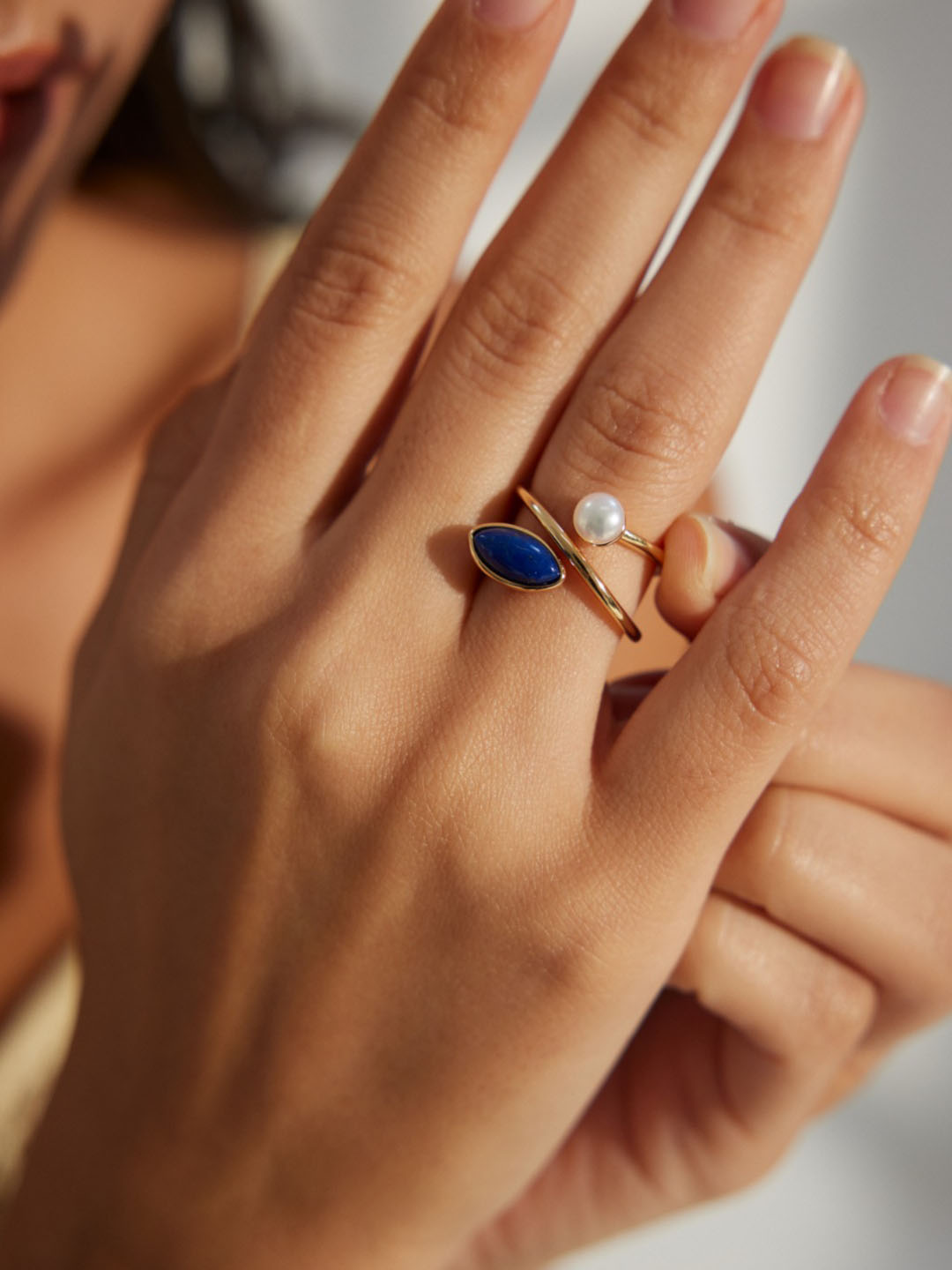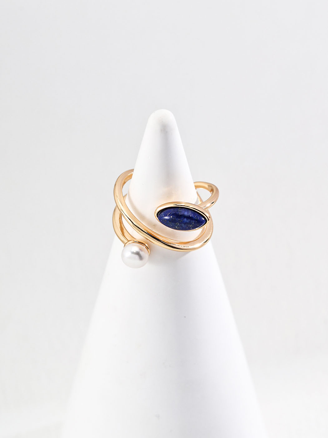 This spiral lapis lazuli pearl ring captures attention with its graceful contrast of gemstones and design. The twisted open band curves elegantly, holding a luminous 6 mm natural pearl on one side and a polished lapis lazuli stone on the other. Moreover, the vintage gold-plated finish highlights the refined structure. As a result, the piece combines artistic movement with timeless elegance, making it stand out as both modern and classic.