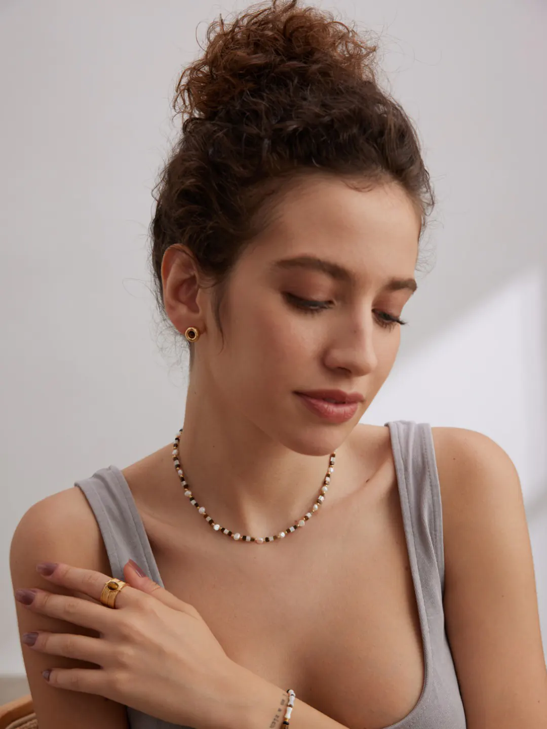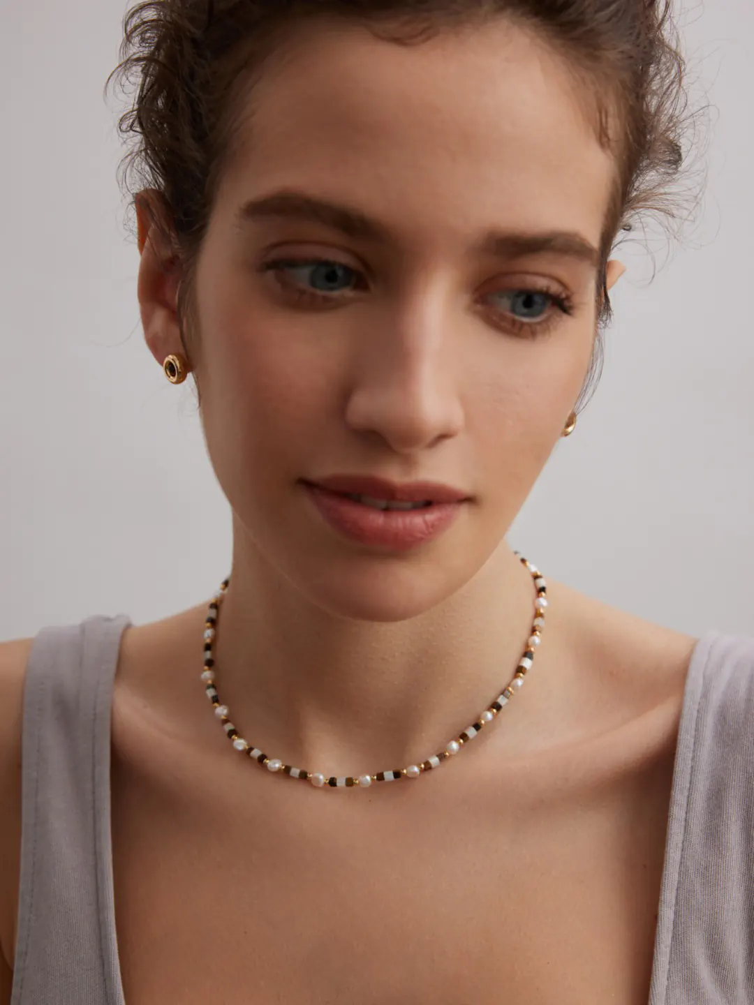 This tiger eye choker is made of 925 sterling silver plated with vintage gold. Tiger eye stones display their golden-brown glow. Natural pearls bring soft luster and delicate beauty. In addition, shell beads reflect gentle iridescence. The adjustable chain measures 36.5 cm with a 6 cm extender, ensuring a comfortable and versatile fit. Therefore, this piece blends durability with timeless style.
