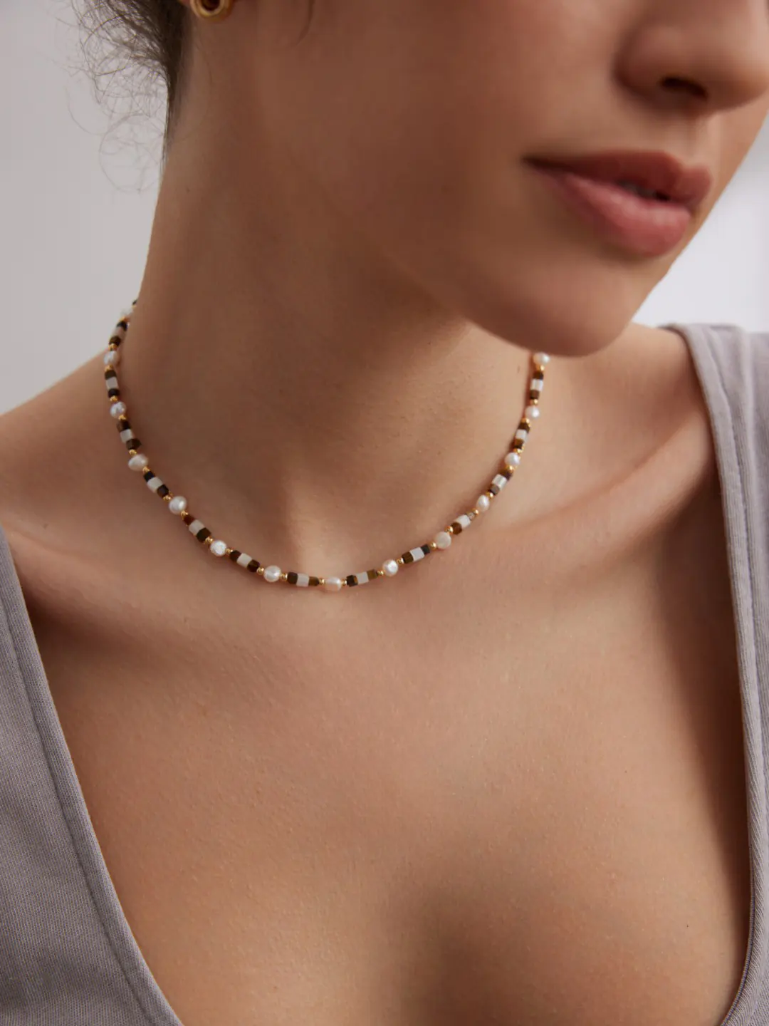 The Wanderer Path Tiger Eye Choker combines natural textures with a refined design. Small rectangular tiger eye stones line up with luminous pearls and iridescent shell beads. Moreover, the arrangement creates a rhythmic pattern inspired by a traveler’s journey. Golden beads add warmth and contrast, while the vintage gold finish highlights every detail. As a result, the necklace feels elegant, earthy, and modern at the same time.