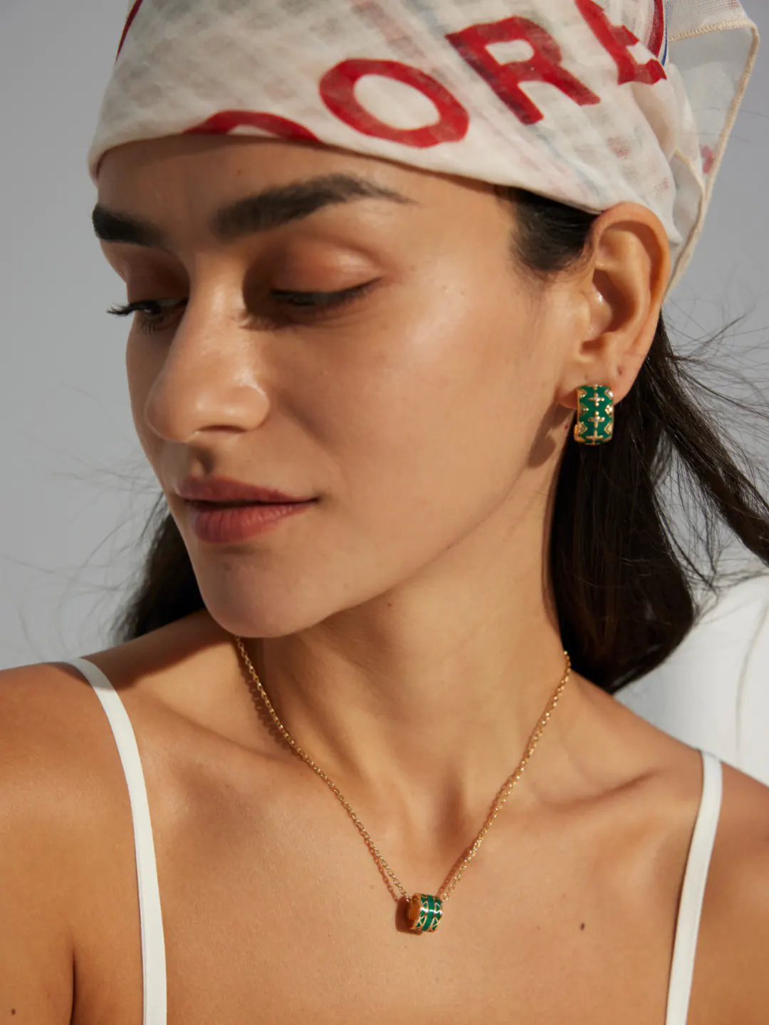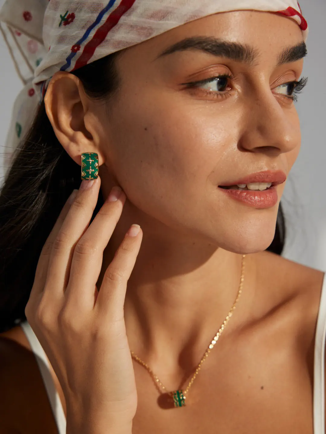 Start with a white tee and denim for crisp contrast. Then add a slim gold chain to echo the lines. For the office, style a cream blouse or navy knit. The green reads sophisticated, not loud. Moreover, the hoops pair well with pearl bracelets and simple rings. For evenings, choose satin or silk in black or emerald. Likewise, a slick bun lets the enamel glow. You can mix thin gold huggies in a second piercing for a curated stack.