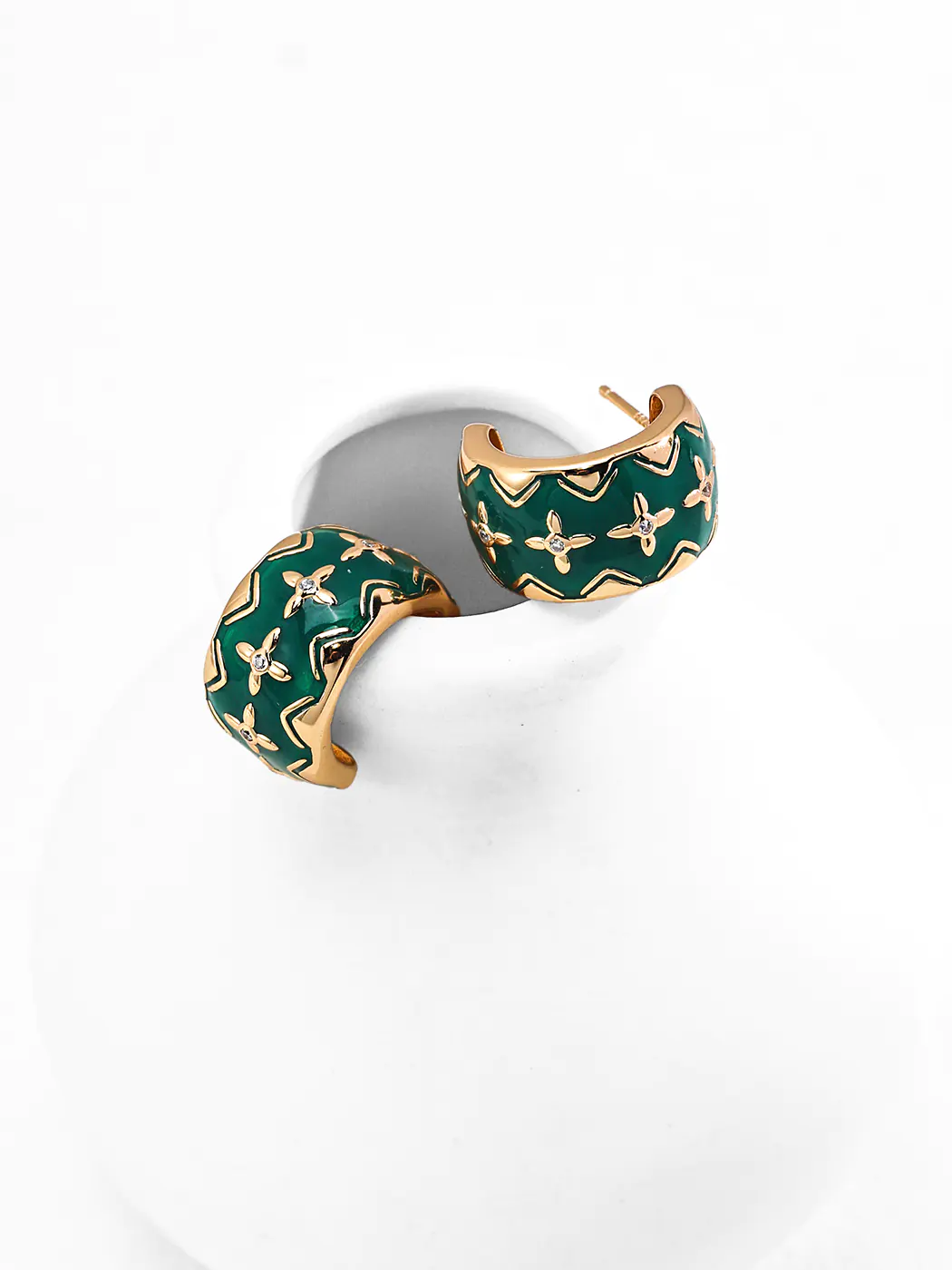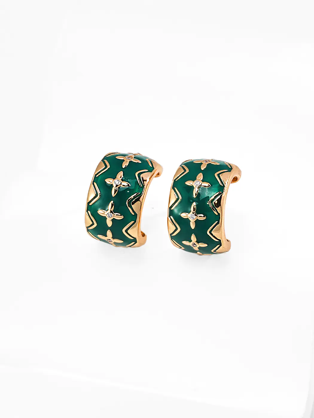 The Zenia CZ Hoops spotlight a bold huggie profile with glossy enamel. A deep green field curves around the lobe. Petite CZ points flash like stars across the surface. Textured gold lines trace chevrons and tiny petals. Consequently, the pattern feels playful yet refined. Each hoop stands 1.7 cm high and 1 cm wide. The curve offers clean volume without bulk. Moreover, polished edges reflect light and frame the color beautifully.